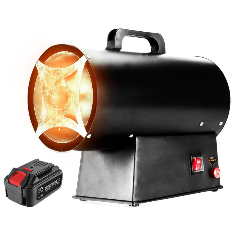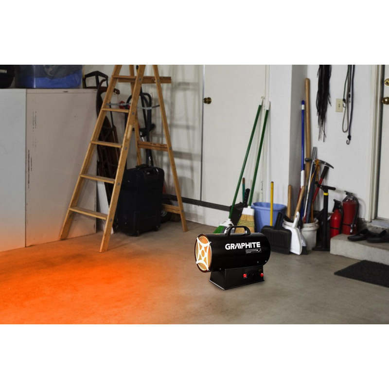Теплова гармата газова GRAPHITE, акумуляторна 18В, 15кВт, 320м3/год, 0.7 бар, витрата 1.09кг/год, редуктор тиску, шланг 1.5м, п'єзозапалювання, IP24 58GE100. Газовий обігрівач призначений для обігріву внутрішніх приміщень підлог цехів, складських приміщень, будівельних майданчиків, а також коли потрібно висушити приміщення або розморозити поверхні та предмети. Конструкція приладу та ручка для перенесення полегшують використання.