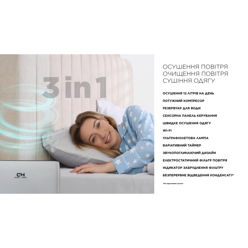 Осушувач повітря Cooper&Hunter CH-D009WD10-20LDUWF, 20л.на добу, 36м.кв , 170м3/год, 450Вт, дисплей, ел.кер-ня, УФ-очистка, Wi-Fi, таймер., білий