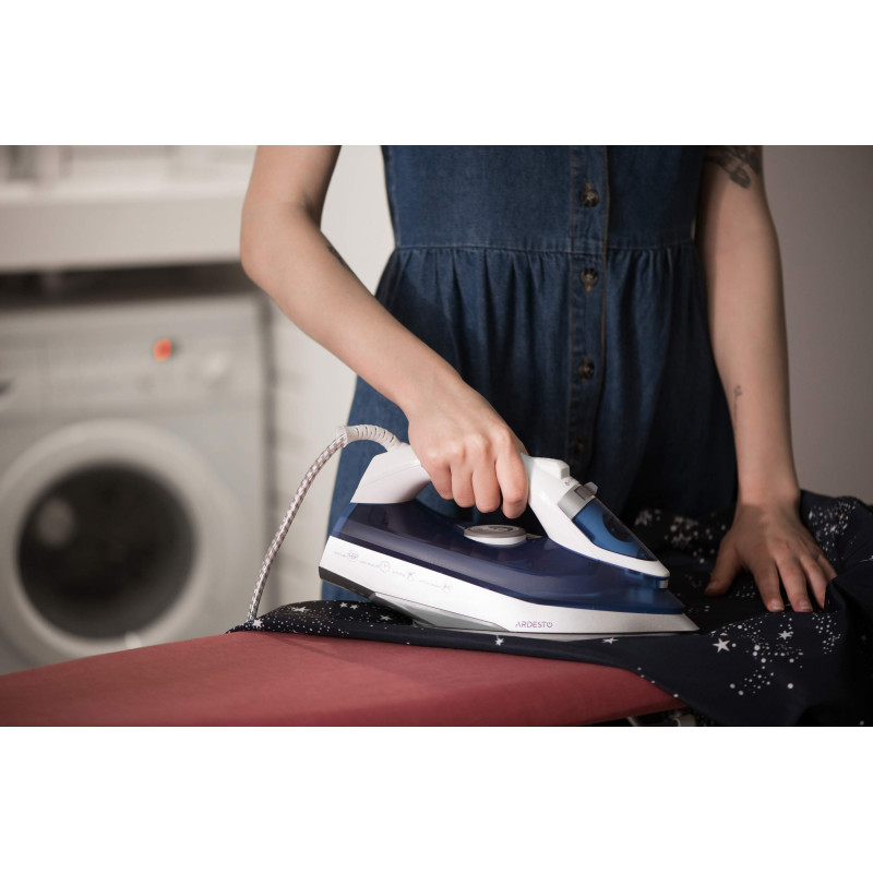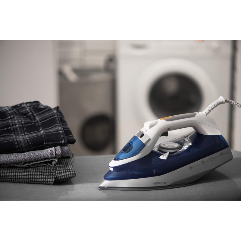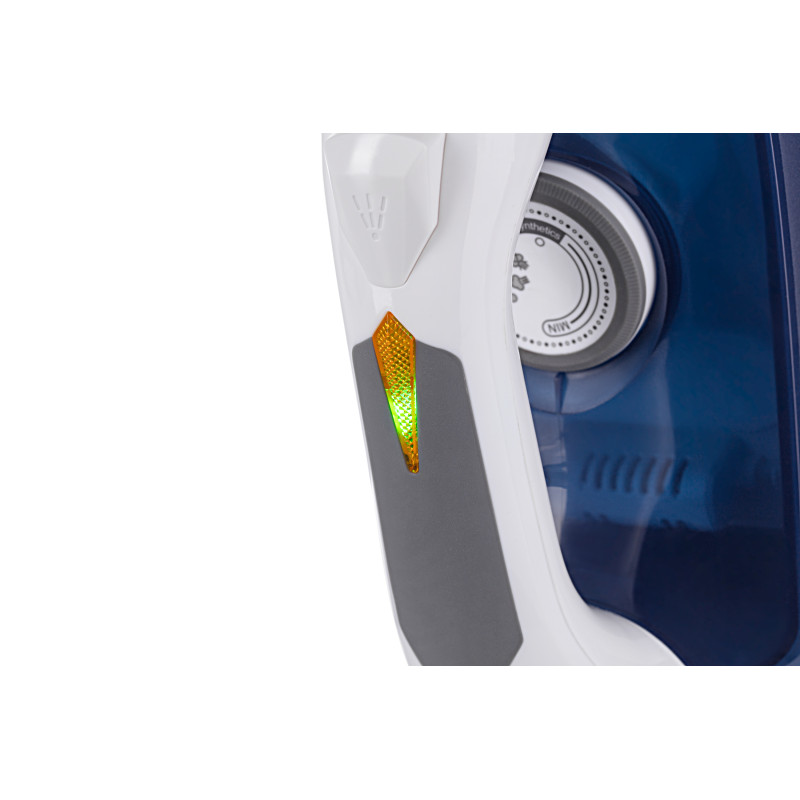 Праска у синьому кольорі з потужністю 2200 Вт, керамічним покриттям підошви, резервуаром на 320 мл, функцією пари, а також захистом від накипу та системою "крапля-стоп".