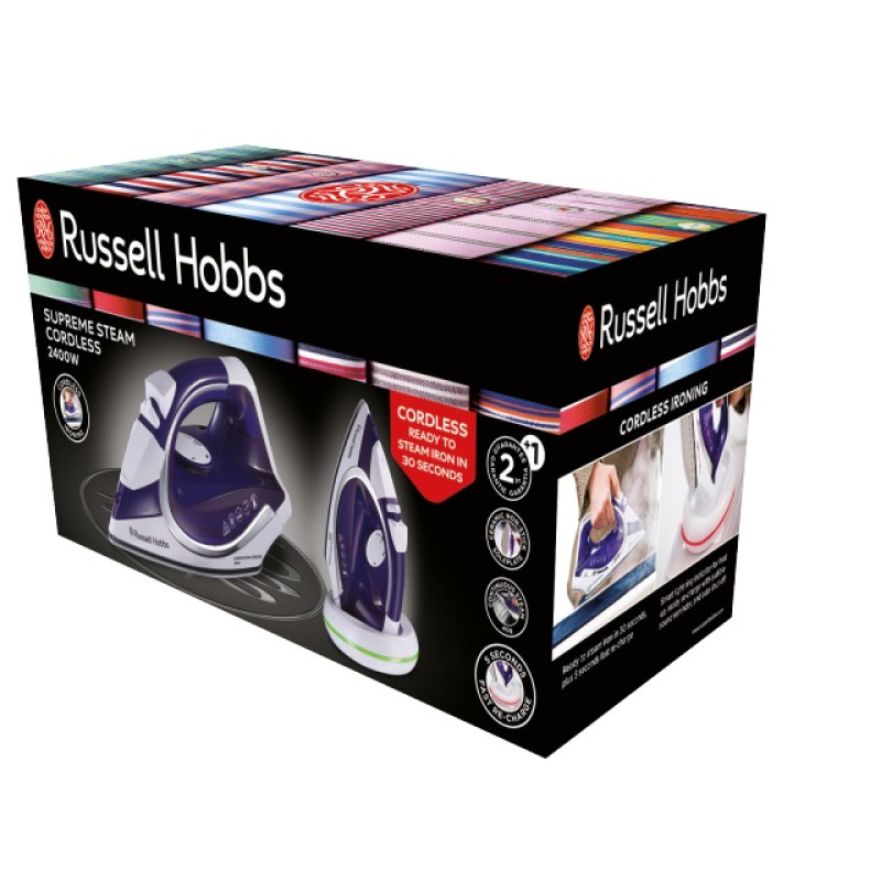 Безпровідна праска Supreme Steam - це інноваційний прилад від Russell Hobbs . Завдяки відсутності шнура, який тримає вас на одному місці, ви можете прасувати одяг там, де вам зручно. Праска встановлюється на спеціальну смарт-підставку зі світловим кільцем. Кільце блимає, щоб повідомити вам про стан вашої праски. Світлове кільце має режим індикатор, аби ви мали змогу знати, коли праска нагрівається, готова до використання і повторної зарядки. Праска також швидко заряджається, має регулювання налаштувань температури та пари, отже ви можете обрати потрібний режим для кожної тканини.