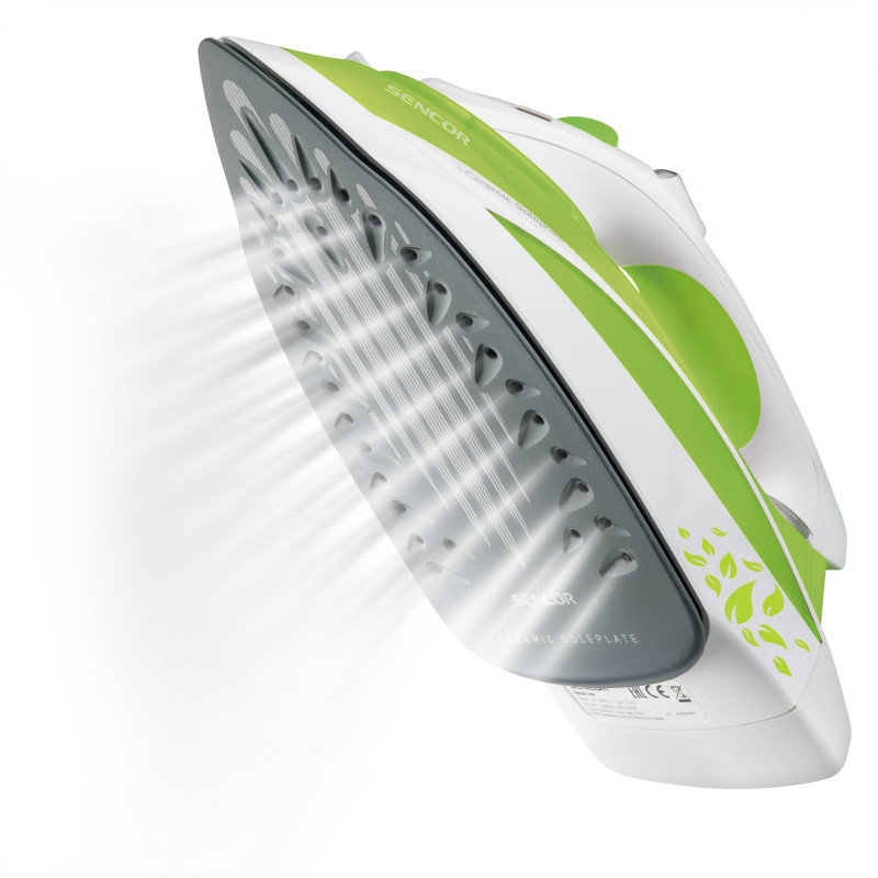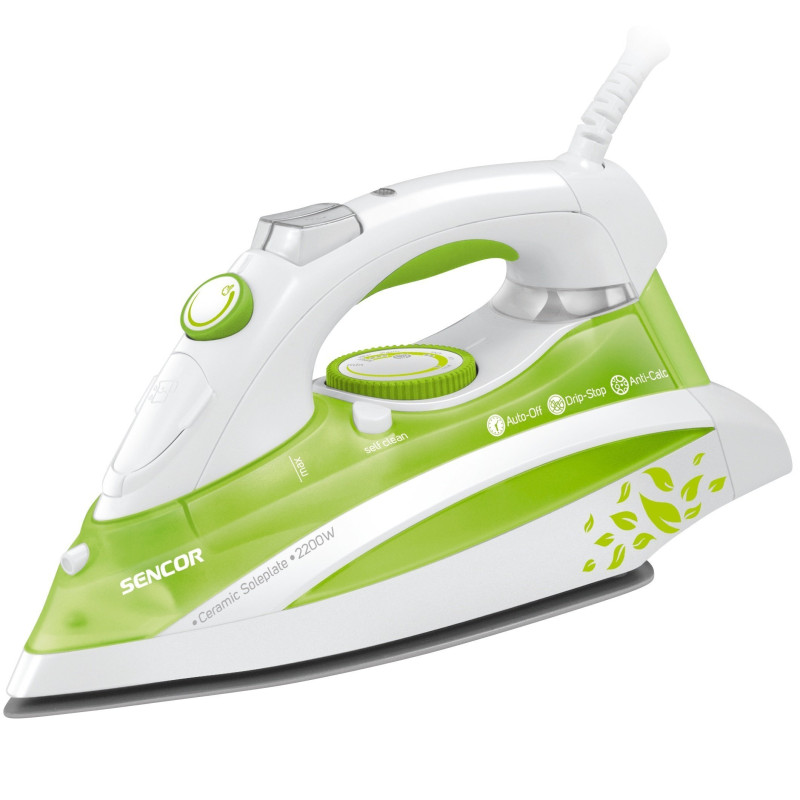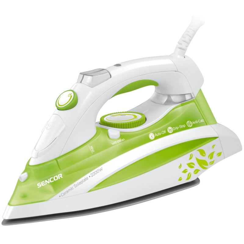 Електрична праска Sencor SSI із керамічною підошвою і потужністю у 2200 Вт. Праска має легкозаповнювальний прозорий резервуар для води (380мл), автоматичне регулювання температури, систему самоочищення для видалення мінеральних відкладень, систему Anti-Calс, що попереджає утворення накипу в отворах. Функція Drip-Stop попереджає попадання на одяг крапель, які залишають плями.