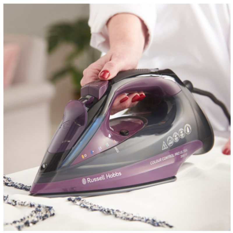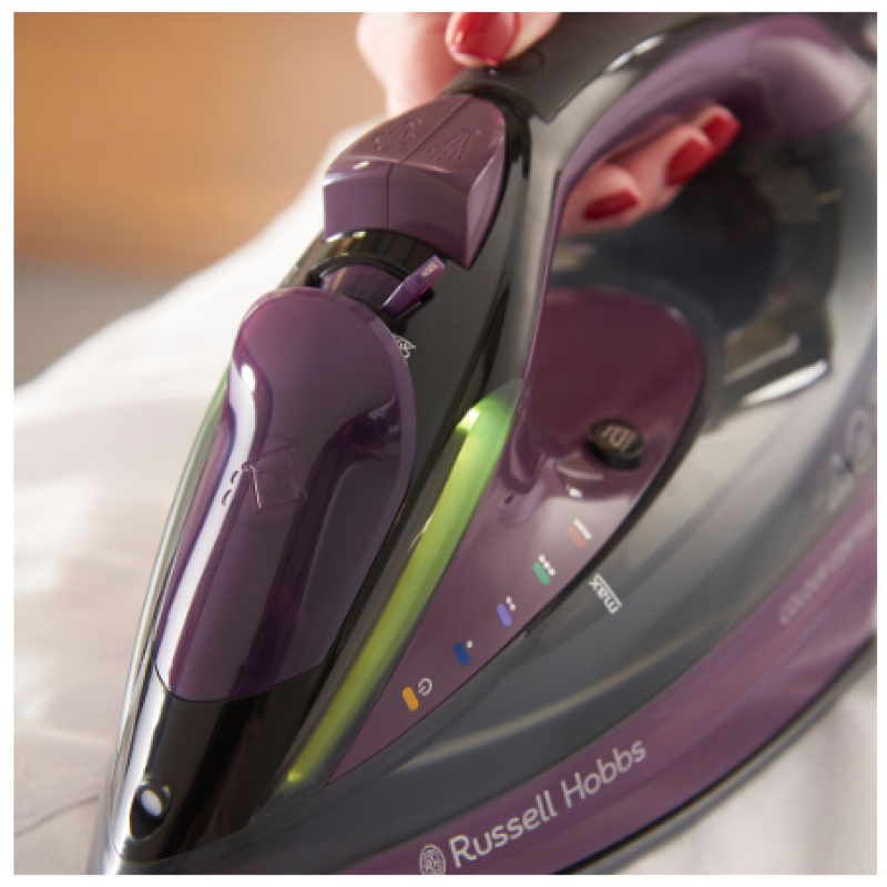Праска Russell Hobbs Color Control Pro Ultra Iron використовує цифрові кольорові дисплеї для вказівки налаштування температури за допомогою зручної кнопки на ручці. Хочете розгладити вовняні вироби або видалити найглибші складки на денімі? Ваша праска засвітиться, коли ви виберете налаштування нагріву, позначені кольором для кожного одягу, що дозволить вам упевнено прасувати!