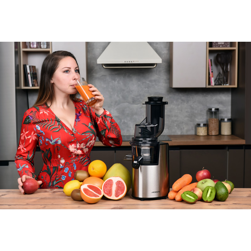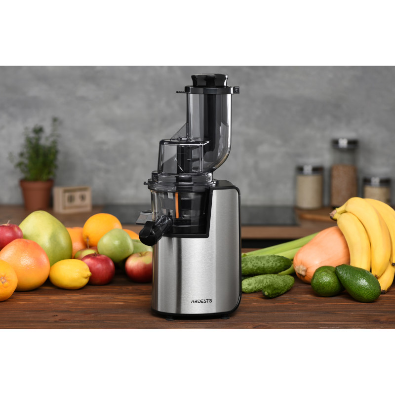 Шнековий соковитискач для приготування соку з різноманітних фруктів, овочів, ягід та навіть горіхів і зелені. Низькошвидкісна технологія витискання забезпечує максимальну екстракцію поживних та корисних речовин без окислення, з мінімумом відходів та сухою макухою. Збільшений завантажувальний отвір дозволяє завантажувати у пристрій цільні інгредієнти, тим самим заощаджуючи час приготування. Компактні розміри та продуманий дизайн сприяють простому та швидкому очищенню без зайвих зусиль.