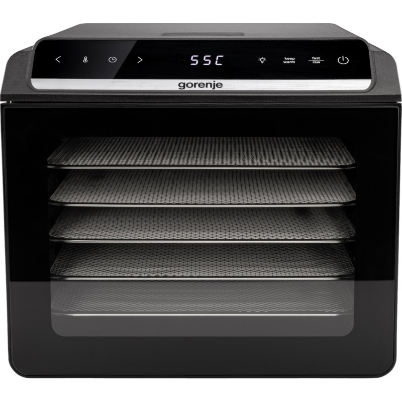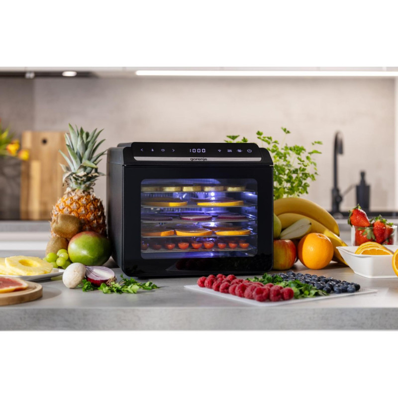 Сушарка для продуктів Gorenje FDK600DB із потужністю 580 Вт та 6 лотками діаметром 25 см забезпечує рівномірне висушування на всіх рівнях. Має LED-дисплей, електронне керування, регулювання часу від 0,5 до 48 годин та температури від 35 °C до 75 °C. Підходить для сушіння фруктів, овочів, м’яса, грибів, риби та домашнього печива.