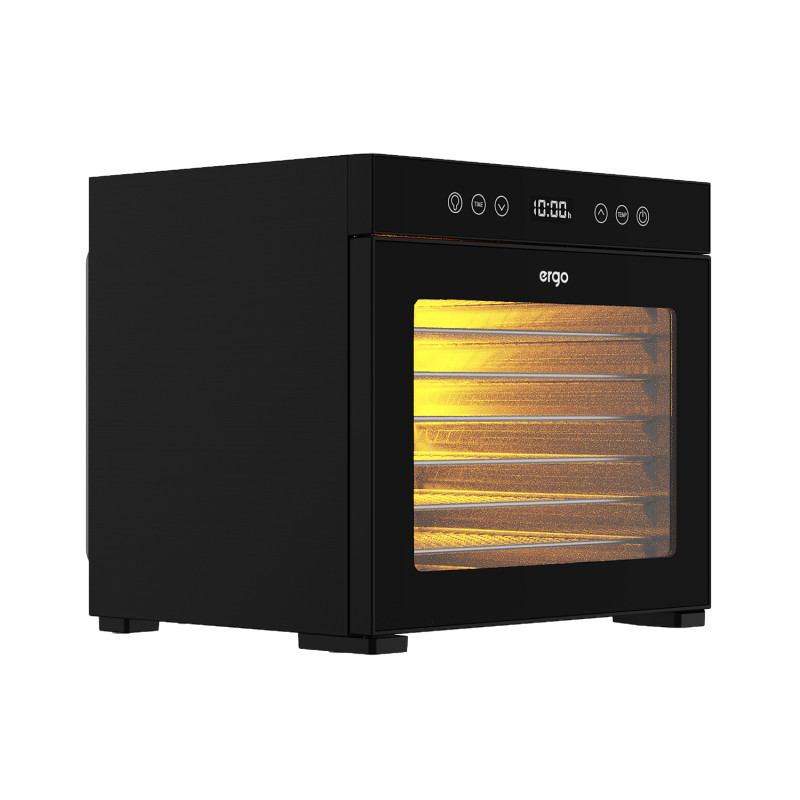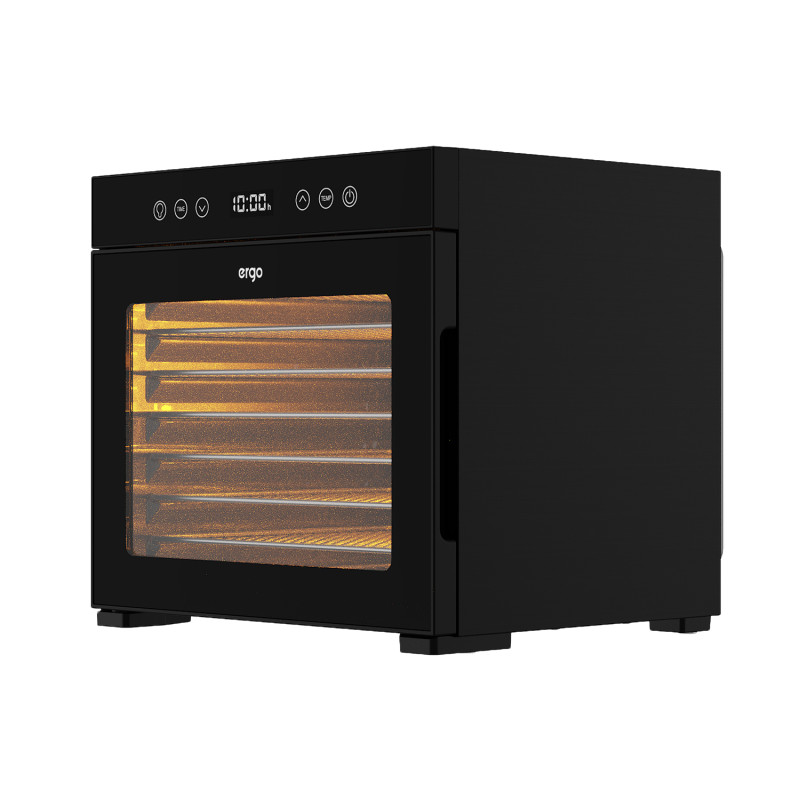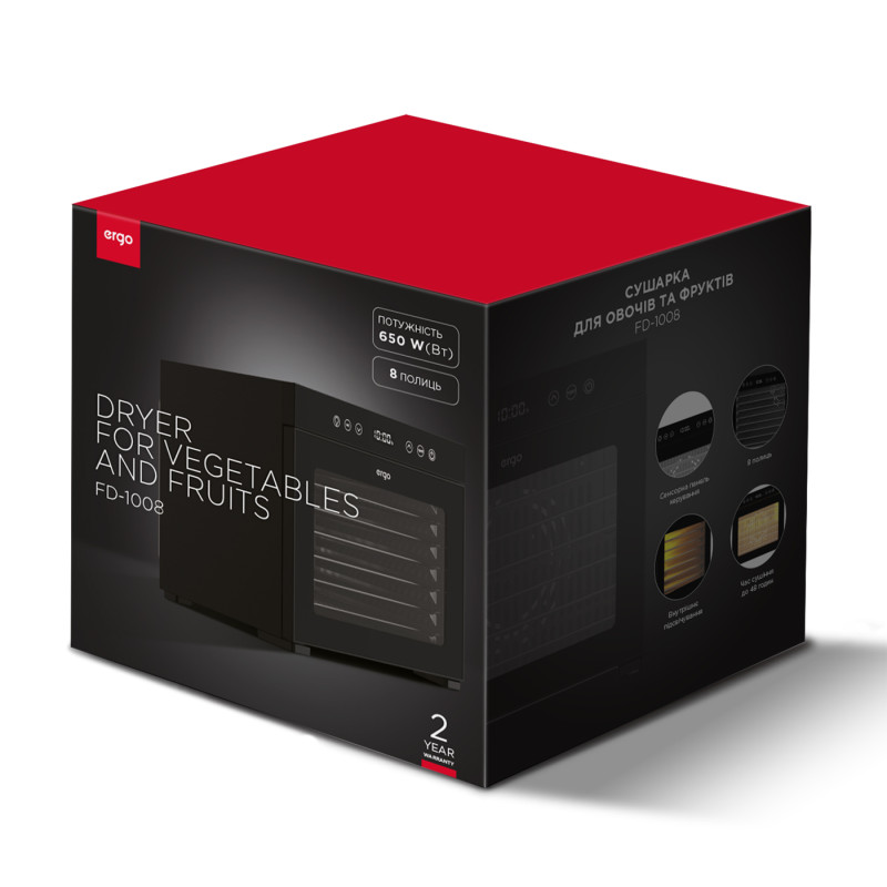 Сушарка ERGO FD-1008 поєднує в собі привабливий дизайн, компактність корпусу й водночас достатню місткість. Вісім полиць дозволяють розміщувати й засушувати велику кількість найрізноманітніших продуктів: овочів, фруктів, ягід, зелені, грибів, горіхів, а також виробів з тіста, м’ясних і рибних продуктів тощо. Ця сушарка дає змогу швидко і безтурботно готувати пастилу, сухі закуски, мюслі, граноли, горіхово-фруктові батончики й багато іншого.