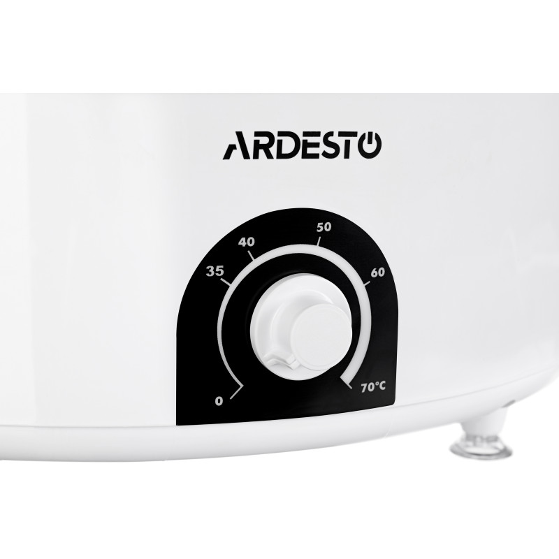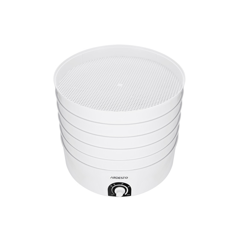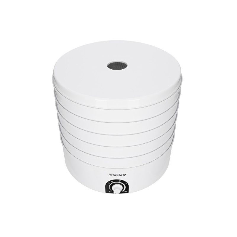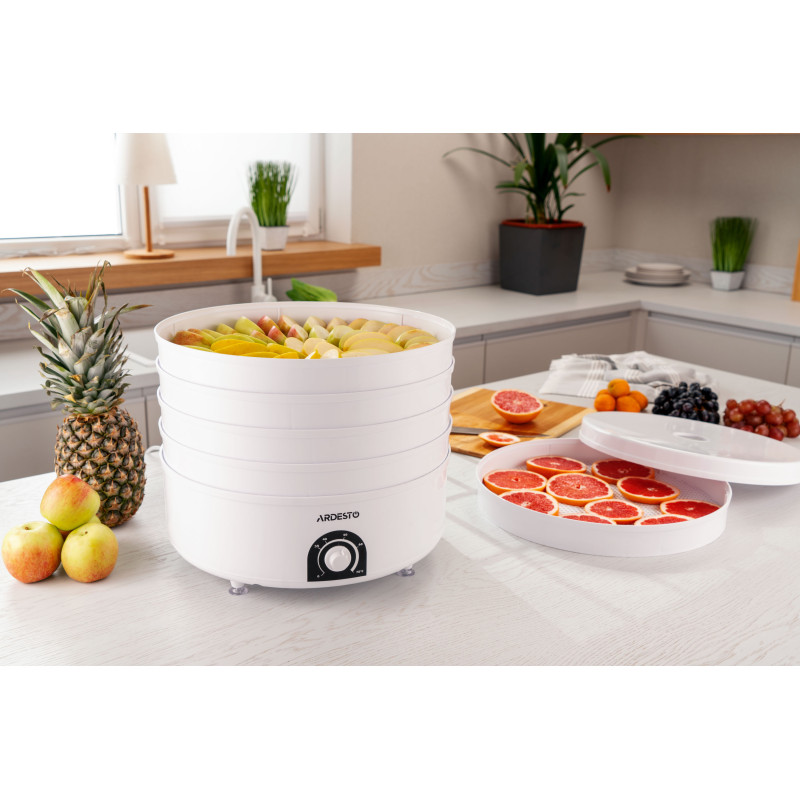 Сушарка для продуктів з потужністю 520 Вт, п’ятьма непрозорими піддонами та регулюванням температури від 35°С до 70°С.