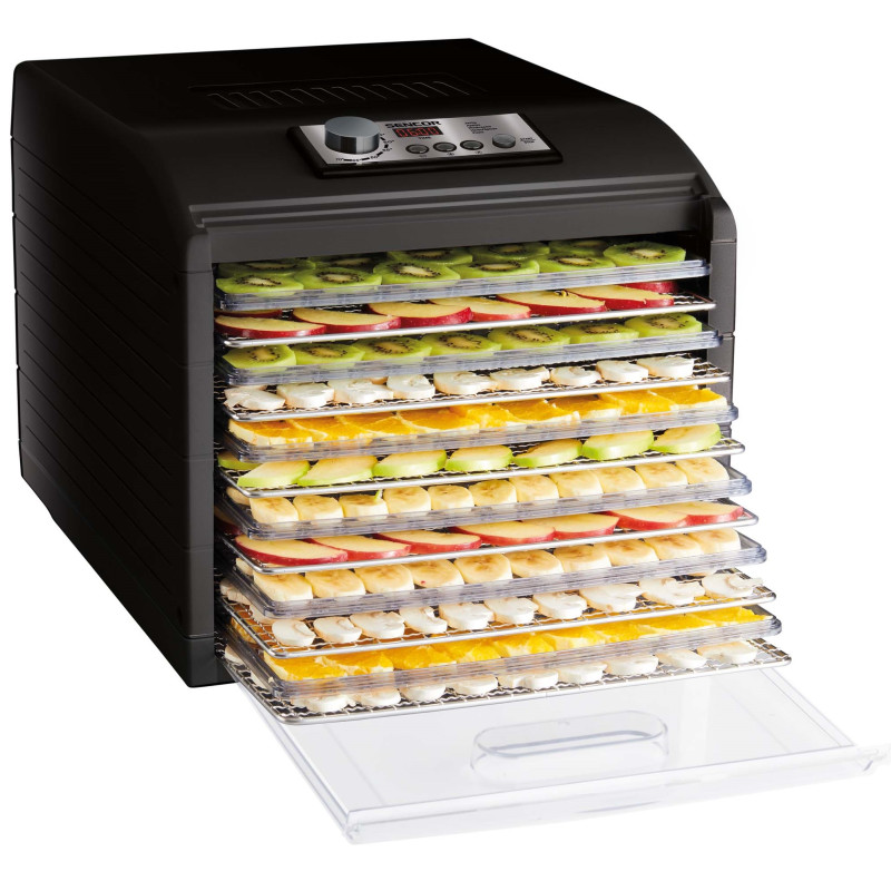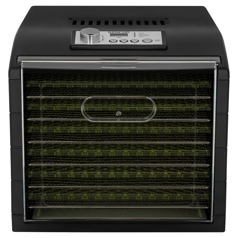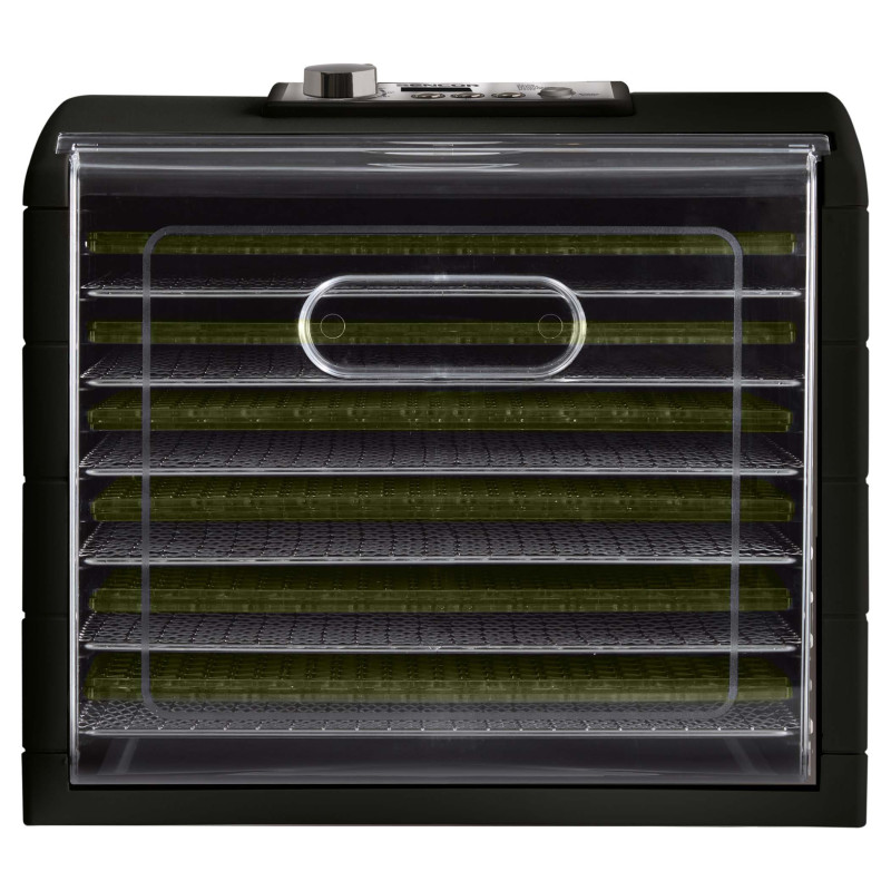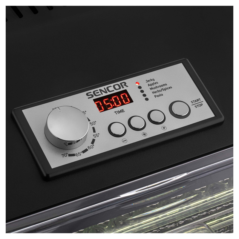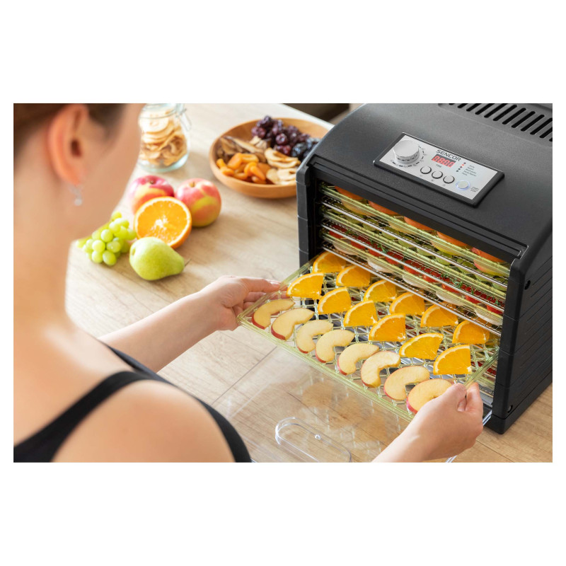 Сушарка великого об'єму із загальною площею сушіння 1,18 м2 (на 65 % більше звичайної сушарки з діаметром 32 см). Регулювання температури за допомогою поворотного регулятора для інтуїтивного керування. Налаштування часу за допомогою режиму швидкого налаштування. 6 металевих та 6 пластмасових термостійких підносів гарантують максимальний комфорт. 1 піддон для приготування продуктів RAW.