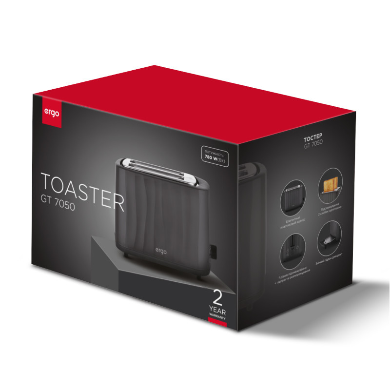 Тостер ERGO GT-7050 оснащується трьома кнопками для ввімкнення режимів роботи й вимикання приладу, а також коліщатком вибору ступеня просмажування й важелем для діставання хліба. Крім приготування тостів, ця модель вміє також розморожувати та підігрівати хліб.