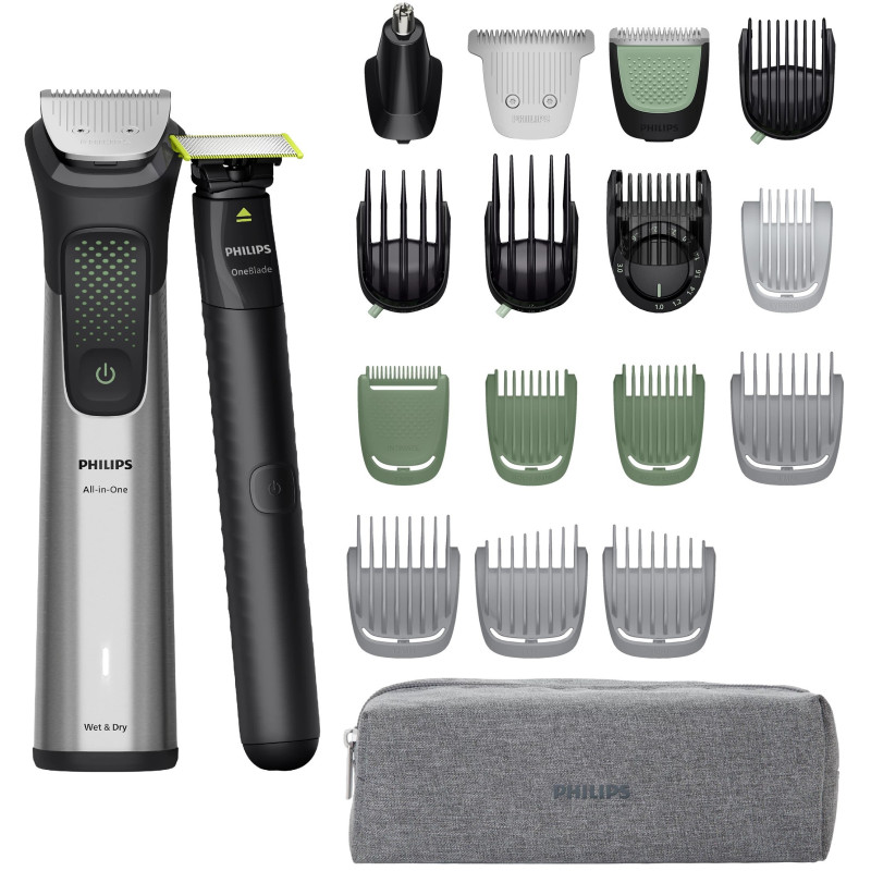 Philips Series 9000 — тример 20-в-1 для догляду за обличчям, волоссям і тілом з металевим корпусом. Леза з нержавіючої сталі із самозаточуванням та OneBlade забезпечують чисте й точне підстригання і контури. Регульована насадка підтримує крок 0,2 мм з діапазоном 0,2–20 мм, а BeardSense автоматично підлаштовує потужність під густоту волосся. Пристрій працює до 120 хв без підзарядки, водонепроникний і зручний у подорожах.