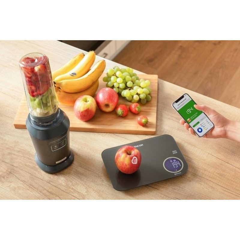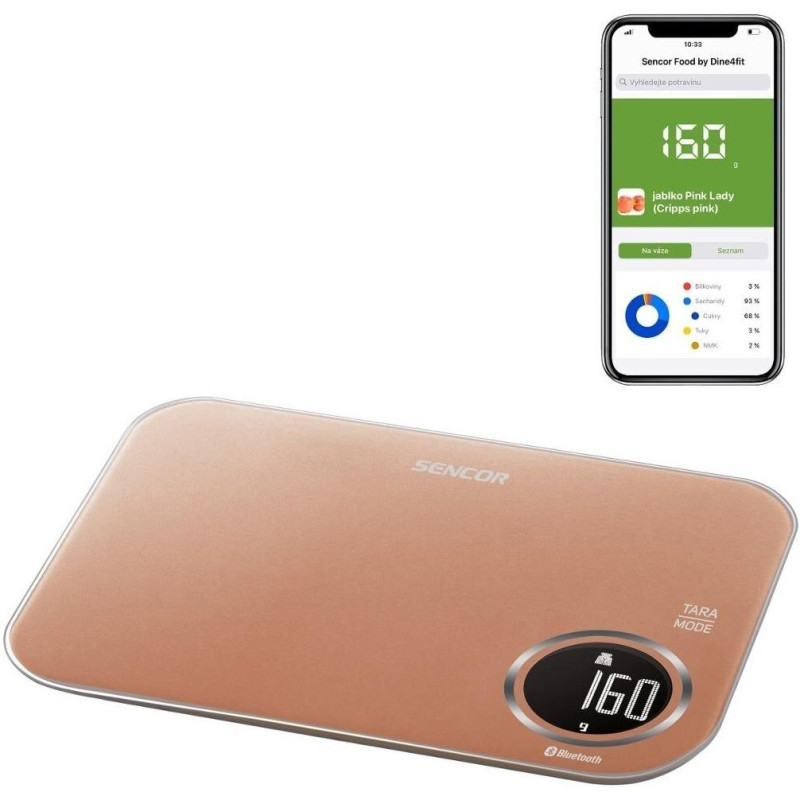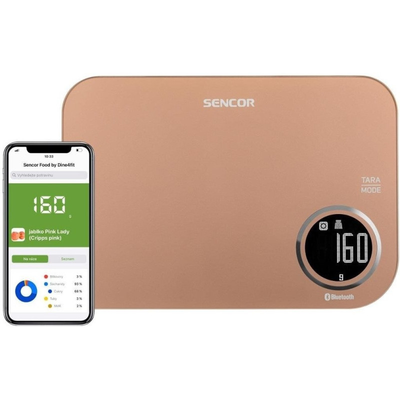 Ваги Sencor кухонні. Оригінальний додаток Sencor FOOD, створений у співпраці з авторами Dine4Fit з багатою базою даних продуктів харчування. Дає докладну інформацію про вживану їжу (вуглеводи, білки, жири, холестерин, клітковина…). РК-дисплей з білим підсвічуванням. 3 режими: режим зважування/режим вимірювання об'єму молока/режим вимірювання об'єму води.
