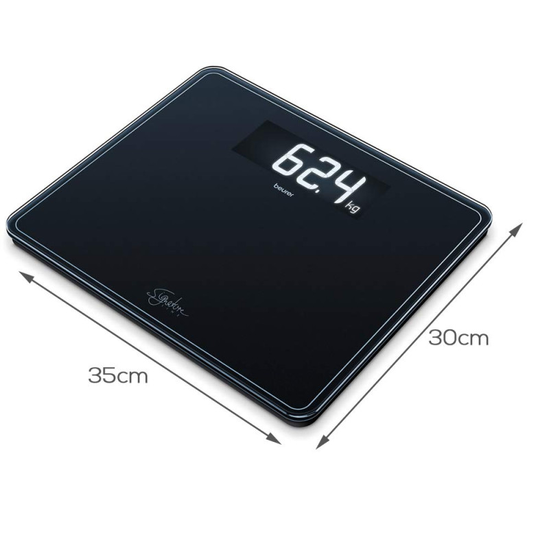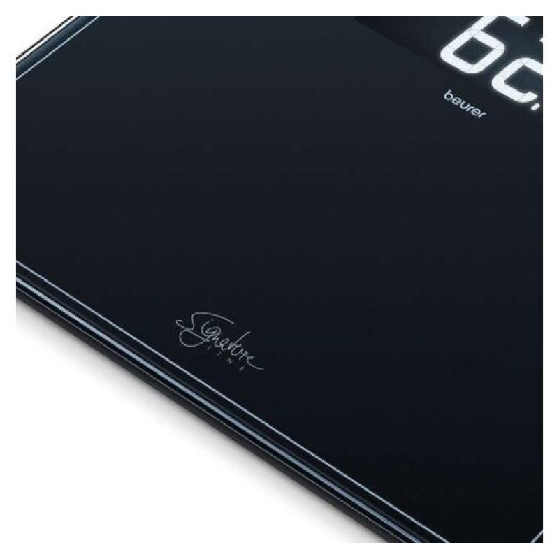 Скляні ваги насиченого чорного кольору Beurer GS 410 Signature Line — мінімалістичний дизайн і функціональність в одному пристрої! Точні дизайнерські ваги не тільки покажуть результати зважування, а й ідеально впишеться в інтер'єр вашого будинку як декоративний елемент. Велика платформа з міцного скла завтовшки 8 мм — комфортне й безпечне використання. Цифри збільшення розміру зі спеціально розробленим РК-шрифтом на сучасному чорному дисплеї з підсвіткою — значення ваги завжди можна легко прочитати навіть за низького освітлення.