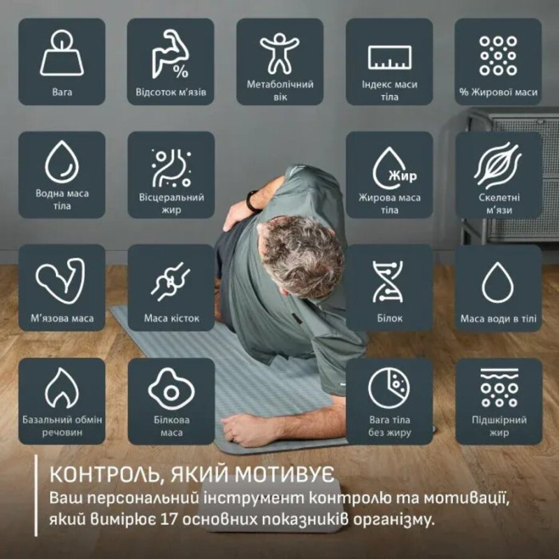 | Діагностичні можливості | вага тіла, метаболічний вік, маса жиру, м’язова маса, кісткова маса, вміст води в організмі, безжирова маса тіла, вісцеральний жир, базальний метаболізм, підшкірний жир, відсоток жиру, рівень білка, скелетні м’язи, частка м’язової маси, маса білка, маса в |
