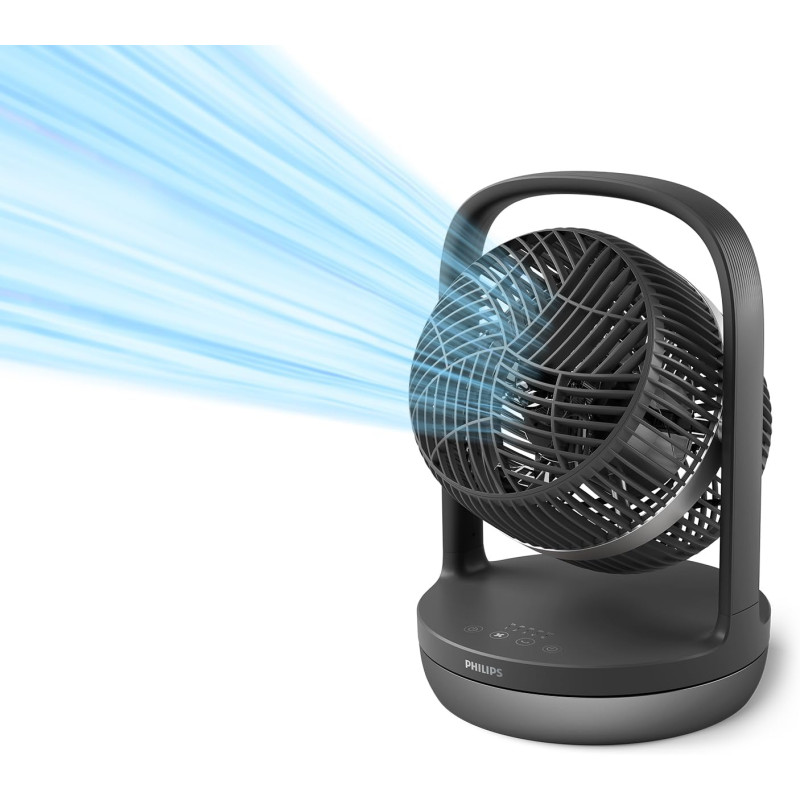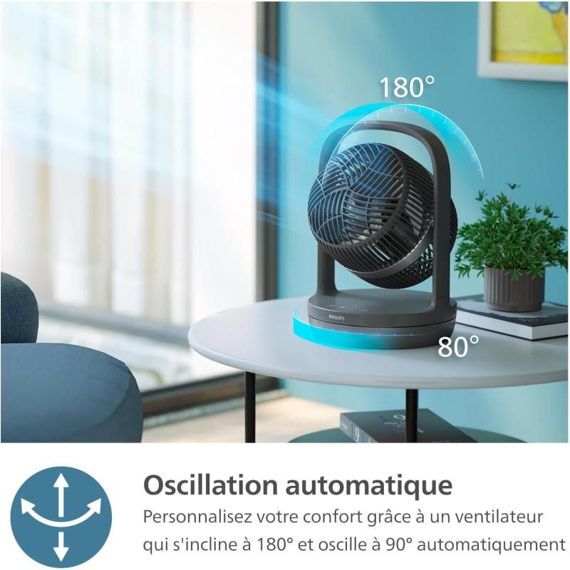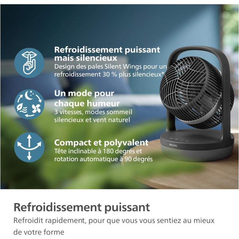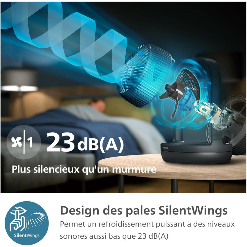 Максимальне охолодження, мінімальний шум. Вентилятор розроблений так, щоб вписатися в будь-який інтер'єр і тихо охолоджувати ваш простір. Налаштуйте його відповідно до ваших потреб: 3 швидкості, 2 режими і таймера. Крім того, насолоджуйтеся покращеною циркуляцією повітря завдяки його нахиляючійся голівці.