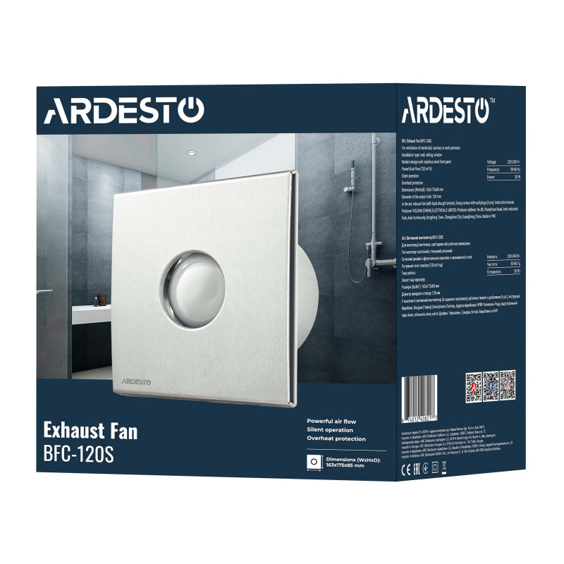 ARDESTO BFC-120S – це ефективний витяжний вентилятор потужністю 20 Вт і продуктивністю 120 м³/год. Модель має максимальну швидкість обертання 2 300 об./хв і низький рівень шуму (33 дБ). Згодиться для монтування на стелю або стіну. Виконаний у стриманому сріблястому кольорі, тож пасуватиме чи не до будь-якого інтер’єру.