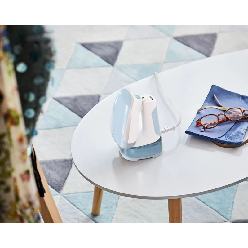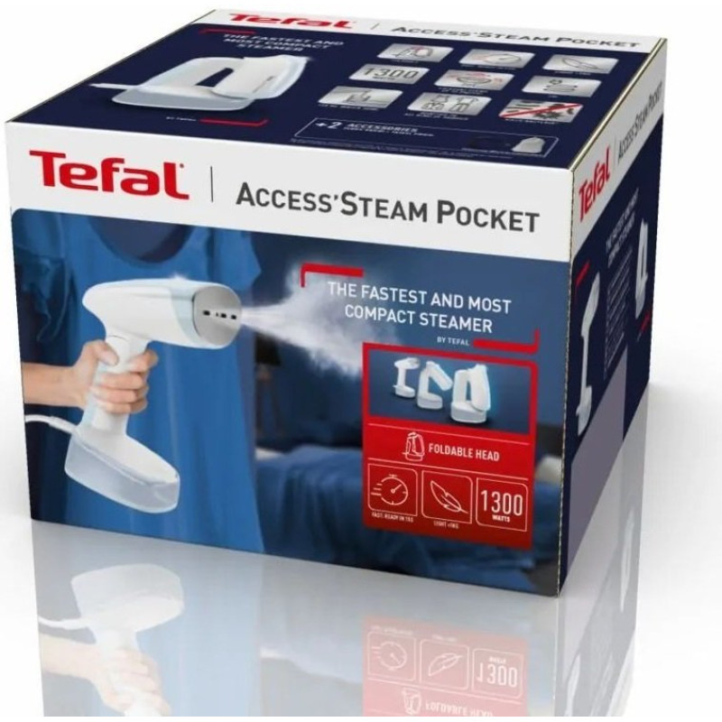 Відпарювач Tefal ACCESS'STEAM POCKET - це компактний пристрій з потужністю 1300 Вт, призначений для зручного відпарювання одягу. Забезпечує постійний потік пару у кількості 20 грамів, що робить його ефективним для видалення складок і освіження тканин. Його біло-блакитний дизайн надає йому стильний вигляд, а компактні розміри роблять його легким у зберіганні та перенесенні.
