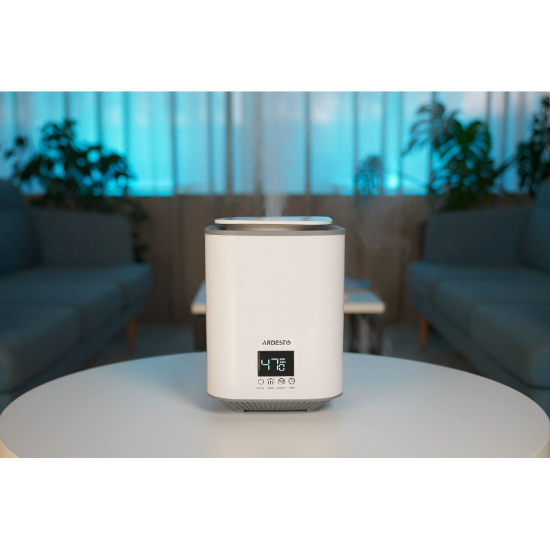 З ультразвуковим зволожувачем повітря ARDESTO USH-H-26W атмосфера в приміщеннях до 25 м² буде сприятливою і комфортною для роботи, відпочинку чи спортивних занять. Об’єм резервуара для води зі знімною кришкою становить 3,1 л. Інтуїтивне сенсорне керування, таймер із налаштуванням від 1 до 9 год, регулятор інтенсивності випаровування (3 режими) та тиха робота – особливості, які роблять зволожувач вдалим вибором.