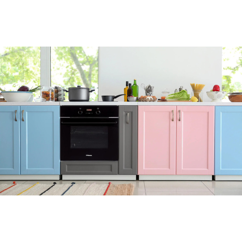 Hansa BOES68463 – електрична духова шафа об'ємом 65 літрів із класичним чорним дизайном. Оснащена 8 режимами приготування, швидким розігрівом на 2900 Вт і системою очищення парою. Має зручне сенсорно-механічне керування, телескопічні напрямні та галогенне підсвічування.