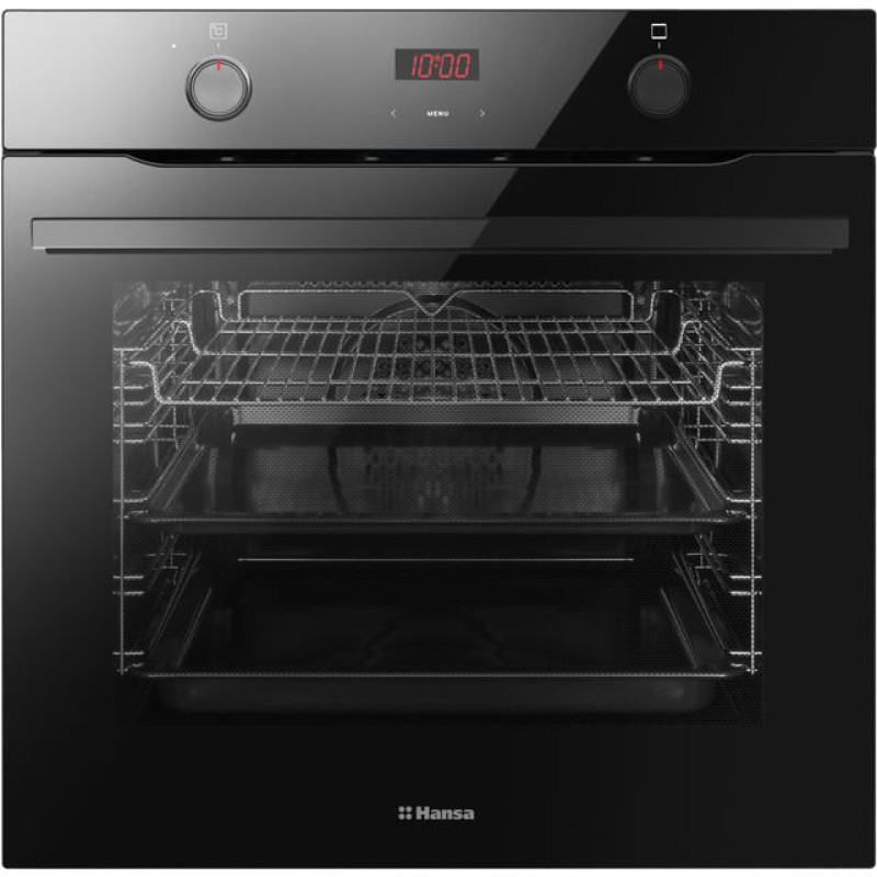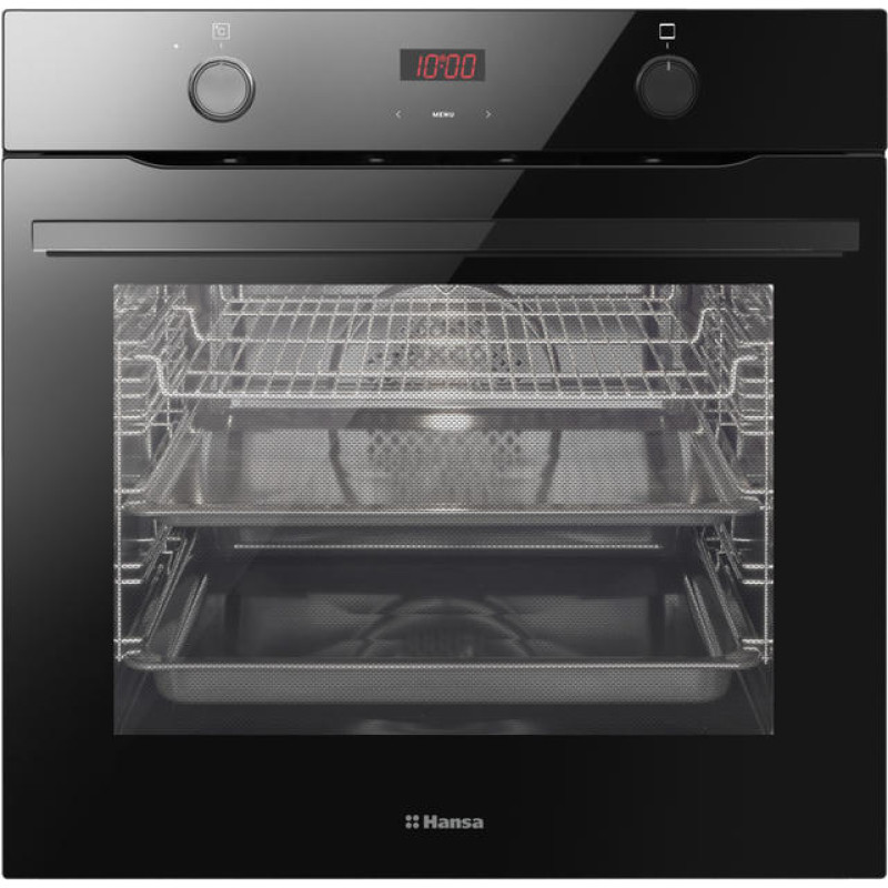 Hansa BOES684620 – електрична духова шафа з об'ємом 77 літрів, чорним дизайном та паровою системою очищення. Оснащена 9 режимами приготування, потужністю швидкого розігріву 3500 Вт і сенсорним керуванням із зручними натискно-тягнучими ручками. LED-дисплей, стандартні бокові напрямні, 3-скляні дверцята та клас енергоспоживання A забезпечують функціональність, безпеку й ефективність у повсякденному користуванні.