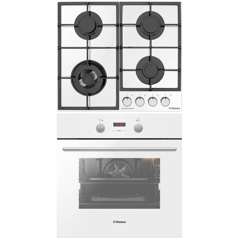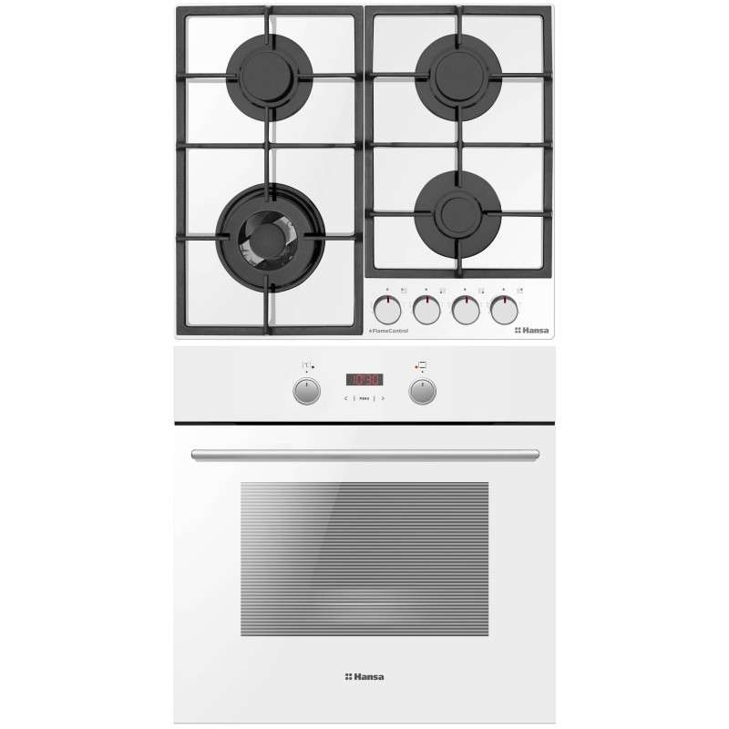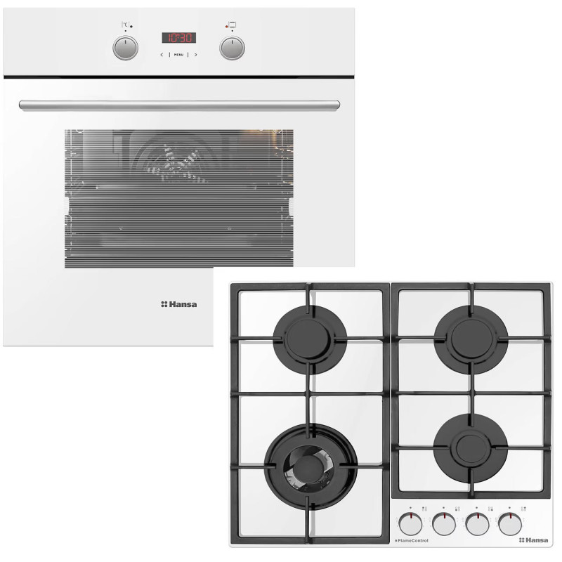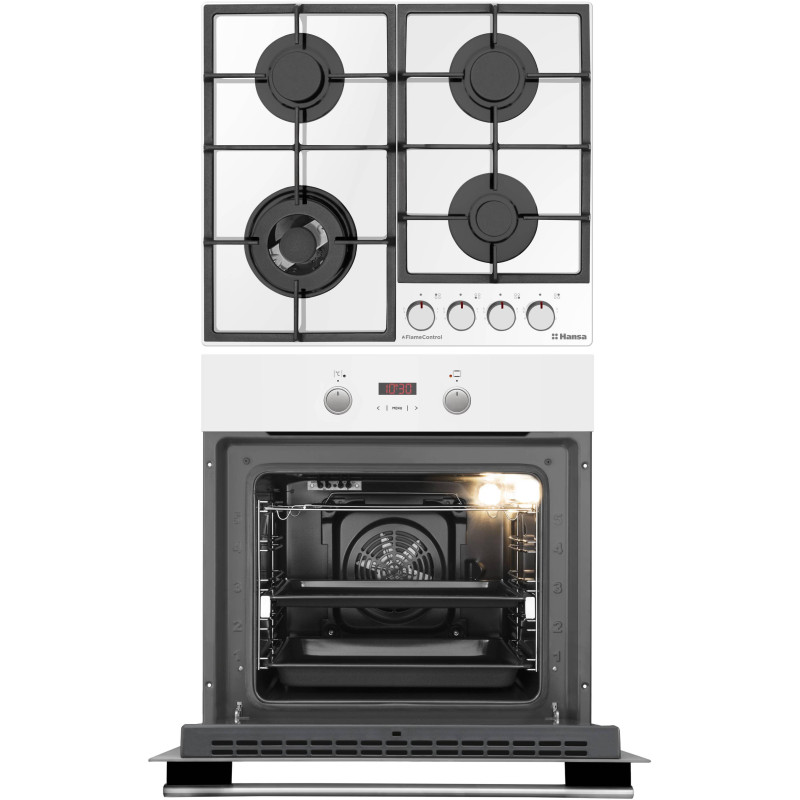 Комплект Hansa FCGW683299 поєднує електричну духову шафу та газову варильну поверхню зі скляним покриттям у білому кольорі. Духовка з паровим очищенням і 8 режимами нагріву забезпечує рівномірне приготування страв, оснащена галогенним підсвічуванням і телескопічними напрямними. Варильна поверхня має 4 газові конфорки від Somipress, чавунні решітки, електропідпал у ручках та захист від згасання полум’я.
