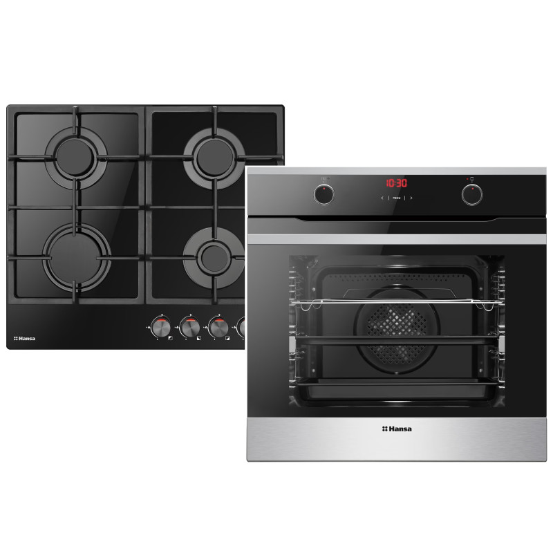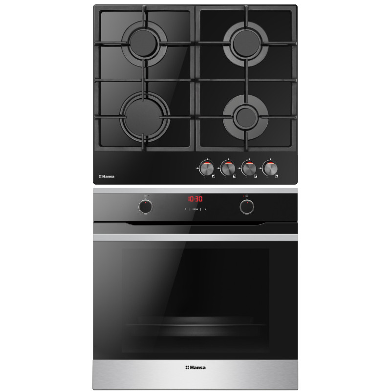 Hansa FCGI69326 – це сучасний комплект, що включає електричну духовку та газову варильну панель на склі в елегантному чорному кольорі. Простора духовка з конвекцією забезпечує рівномірне приготування страв, а газова поверхня оснащена 4 конфорками з автоматичним запалюванням і чавунними ґратами.