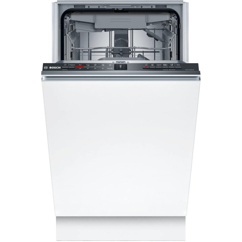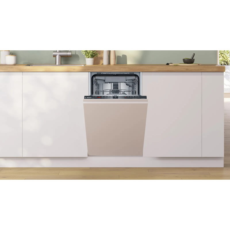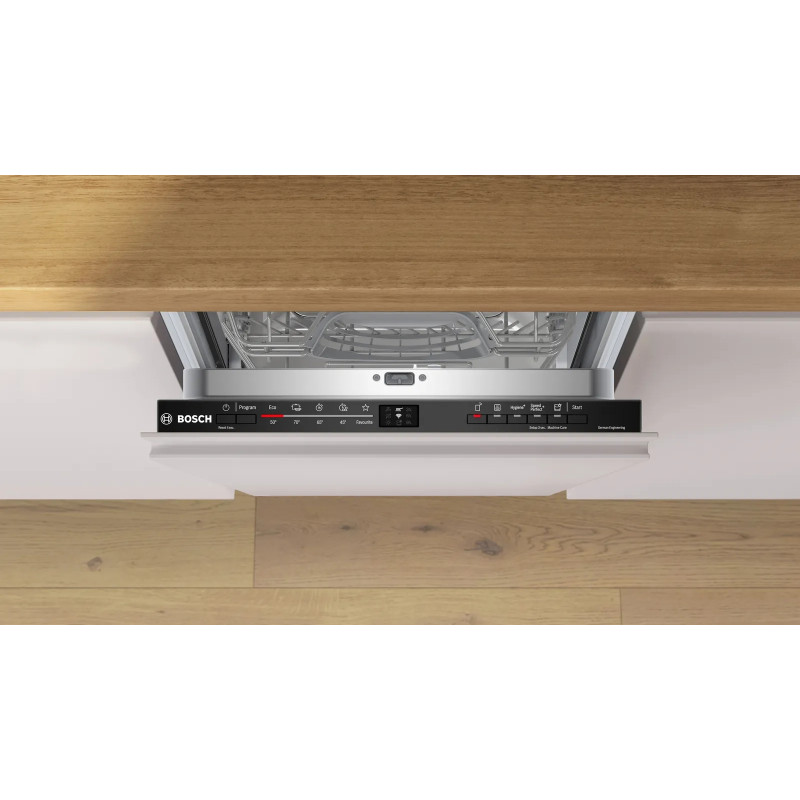 Вбудована посудомийна машина Bosch SPV2HMX03K підтримує Home Connect для дистанційного керування та моніторингу зі смартфона. SpeedPerfect+ скорочує тривалість миття (залежно від програми та моменту активації), а «Тиша на вимогу» тимчасово зменшує шум протягом приблизно 30 хв. Easy Start радить оптимальну програму під тип і ступінь забруднення, а «Улюблене» дозволяє запускати збережені комбінації одним дотиком. RackMatic регулює висоту верхнього короба на трьох рівнях, стопори стабілізують нижній короб.