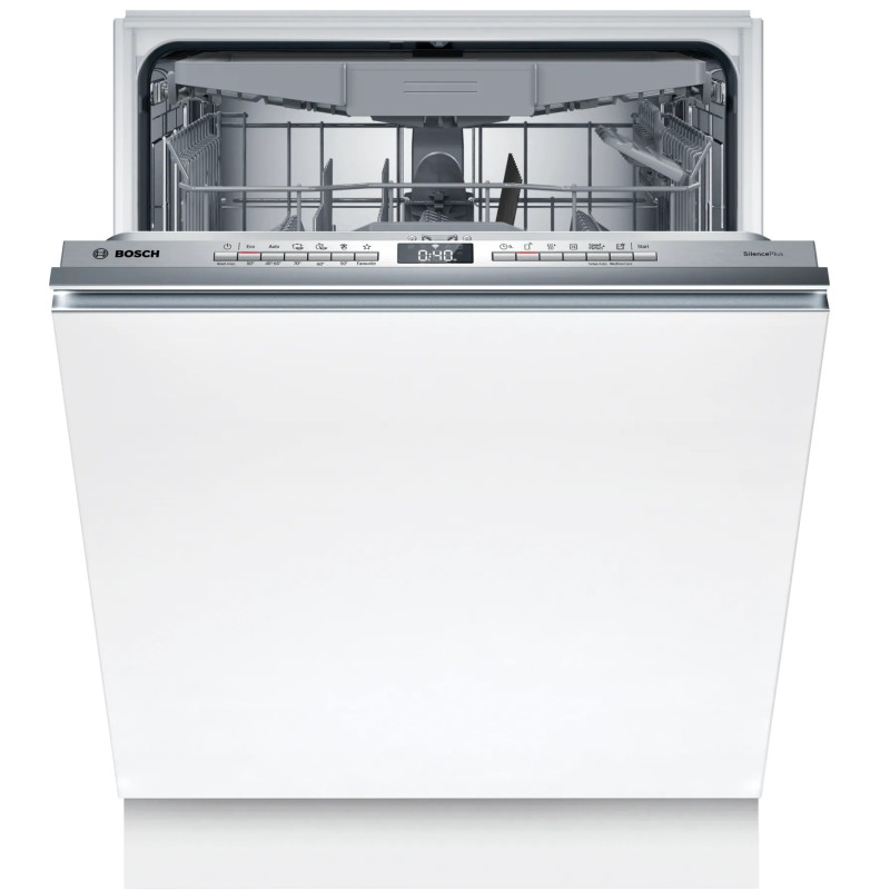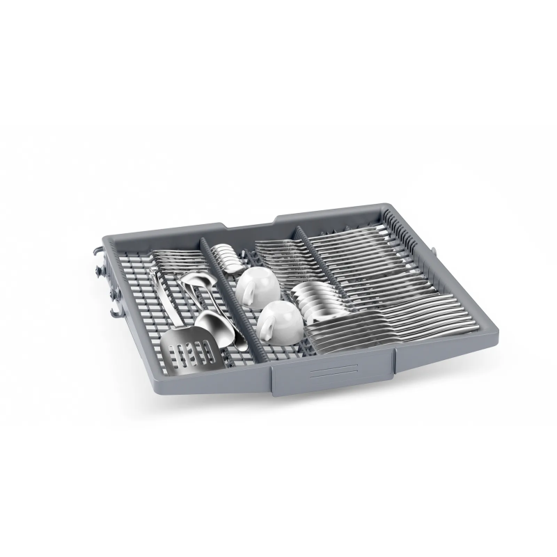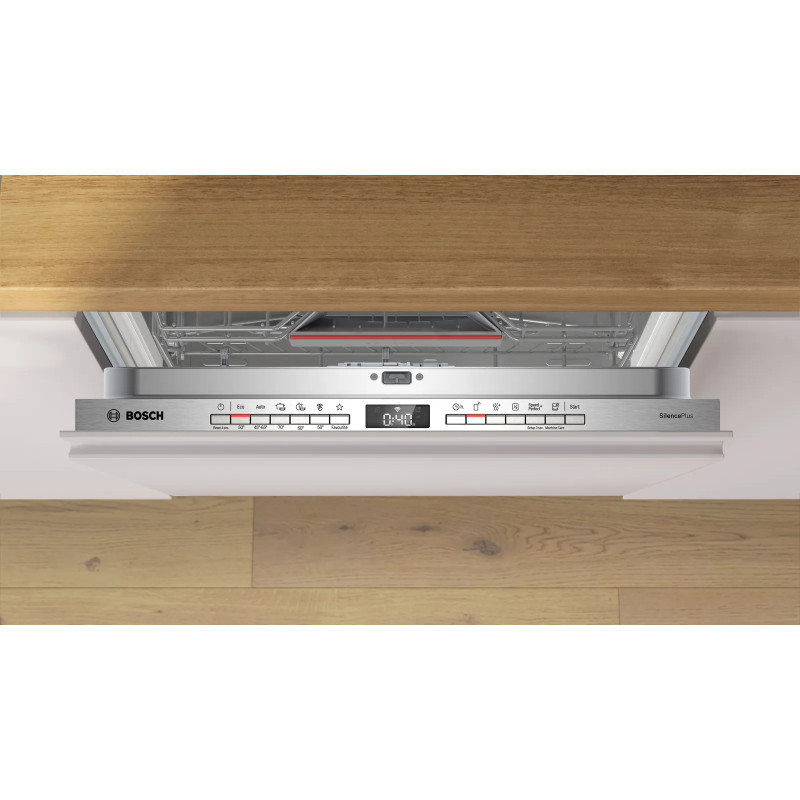 Вбудована посудомийна машина Bosch SMH4ECX28E із VarioHinge для рівномірних зазорів фасадів, третьою полицею VarioDrawer та регулюванням висоти RackMatic. Режим ExtraDry допомагає якісно досушувати пластик, а Home Connect додає віддалене керування, push-повідомлення та поради з вибору програм. AquaStop забезпечує багаторівневий захист від протікань.