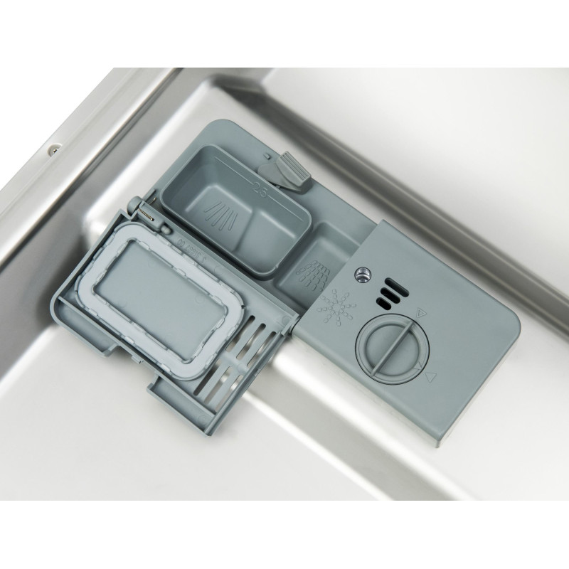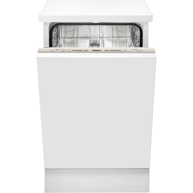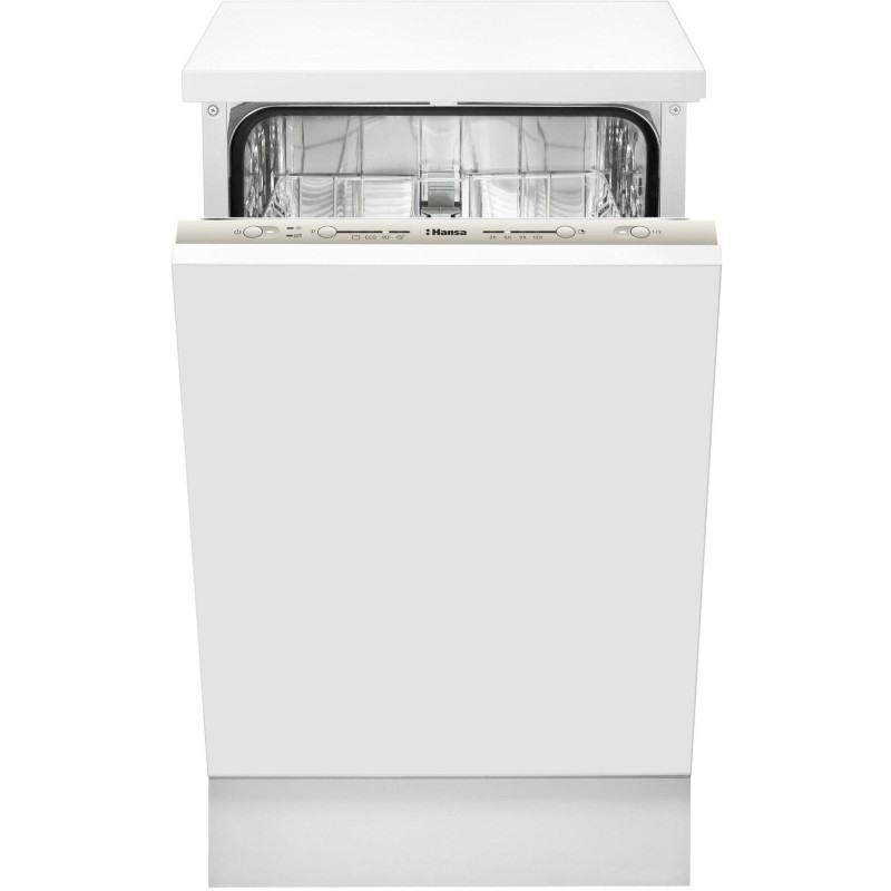 Вбудована посудомийна машина Hansa ZIM434.1B на 9 комплектів із 4 програмами. Має функцію половинного завантаження, відкладений старт (3/6/9/12 год) та індикацію солі й ополіскувача. Споживає лише 9 л води за цикл, рівень шуму — 49 дБ, клас енергоефективності A++.