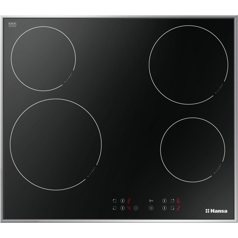 Тип поверхні: Електрична Покриття: Склокераміка Кількість конфорок: 4 шт Розмір (Ш х В х Г): 57.5 х 5 х 50.5 см