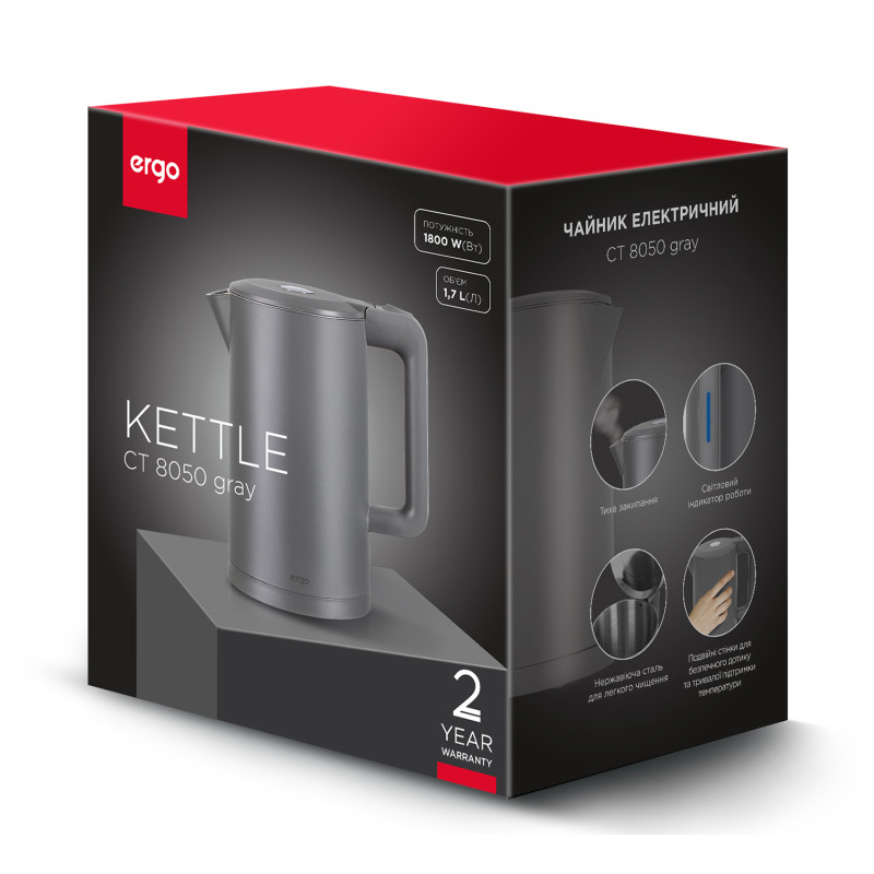 . Потужність: 1800 Вт . Об'єм: 1.7 л . Матеріал корпусу: нержавіюча сталь, пластик