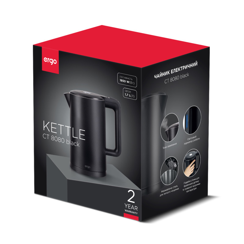 ERGO СT 8070 Black має оптимальний об’єм 1.7 літри та важить 1.47 кг. За допомогою нагрівального елемента у вигляді закритого диску, вода в чайнику закипає за лічені хвилини. Ергономічна конструкція приладу дозволяє легко очищувати його від накипу та забруднень.