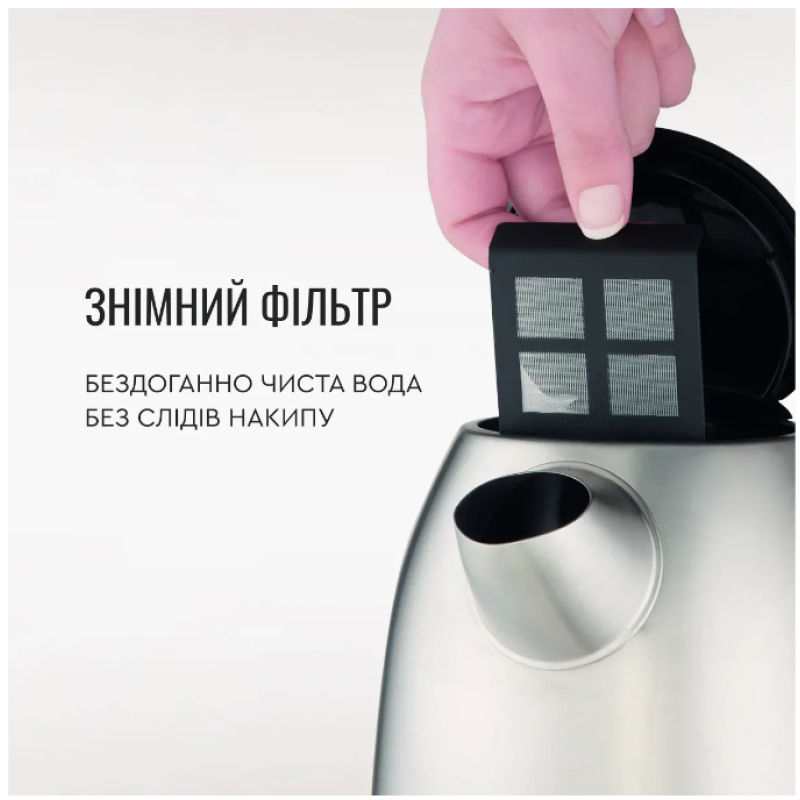 | Оснащення | Фільтр від накипу, Індикатор рівня води, Обертання на 360°, Світлова індикація роботи, Відсік для зберігання шнура |