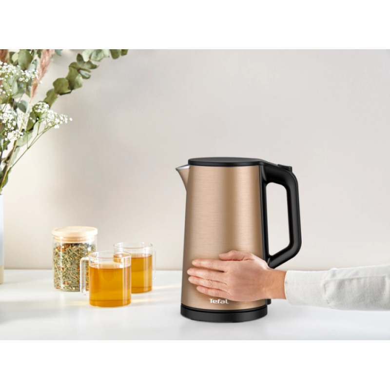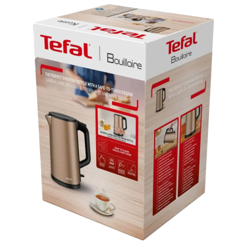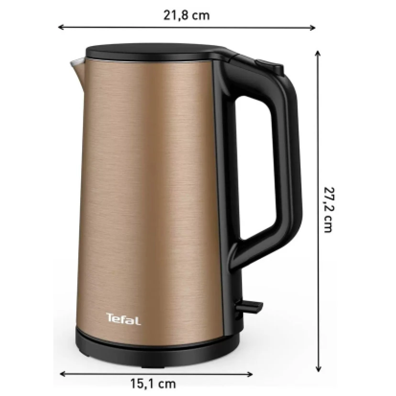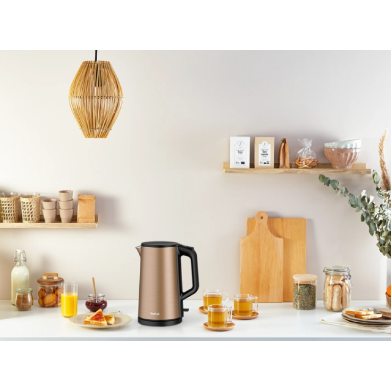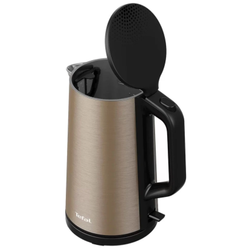 Модель привертає увагу своїм вишуканим дизайном. Крім елегантних мінімалістичних форм і оригінального колірного рішення, електрочайник TEFAL KI583C10 вигідно відрізняють і технічні характеристики. Пристрій виконаний у високоякісному двошаровому корпусі. Якщо порівнювати цю конструкцію з традиційними аналогами, можна переконатися, що електричний чайник з подвійними стінками має кращу теплоізоляцію і вищий рівень безпеки (виключається ризик опіку при дотику до корпусу). Об'єму TEFAL KI583C10 достатньо, щоб за один сеанс закип'ятити воду на 5-6 чашок напою (1,5 л). Висока потужність (2 кВт) дозволяє зробити це за 3-4 хвилини. Зручний механізм кришки забезпечує просте та швидке наповнення ємності, а знімний фільтр захищає від попадання накипу. Прилад комплектується знімною базою-підставкою із прихованим нагрівальним диском. Для зручності чайник Tefal оснащений захистом від увімкнення без води та світловим індикатором.