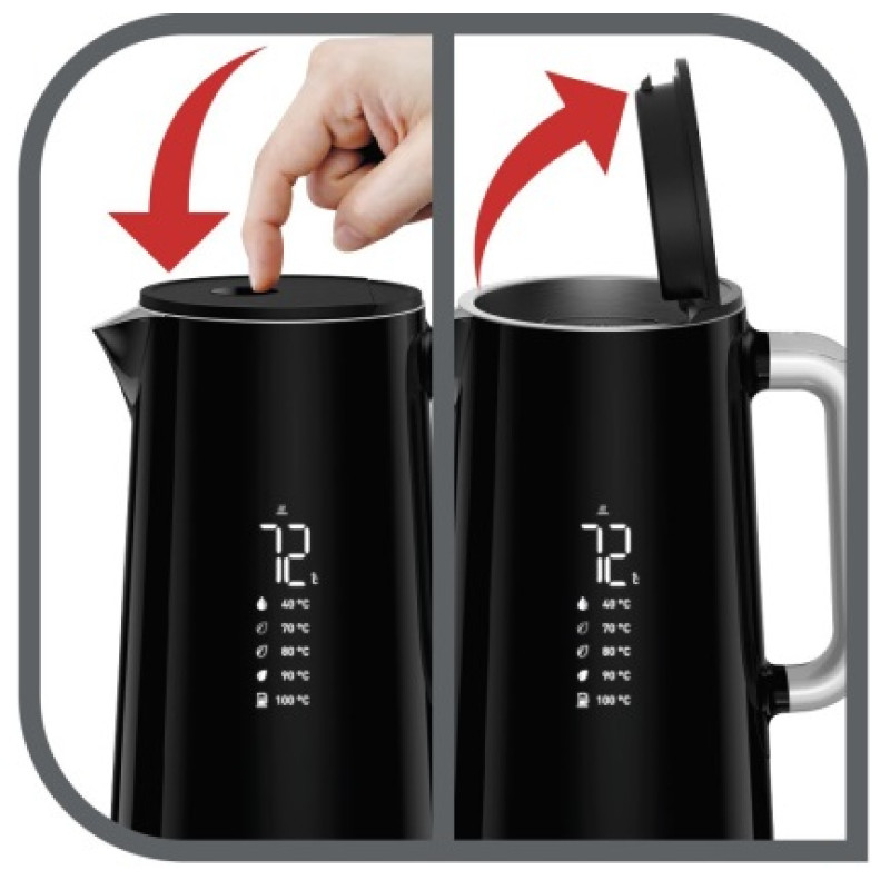 Насолоджуйтесь гарячими напоями правильної температури, ідеально адаптованої до смаку, з електричним чайником Tefal - сучасним, інтуїтивно зрозумілим, одночасно вишуканим і прогресивним. Чайник має суцільний мінімалістичний цифровий дисплей на стінці, що показує температуру води всередині та пропонує на вибір 5 режимів температури від 40 °C до 100 °C - ідеально для нагріву води одним дотиком.