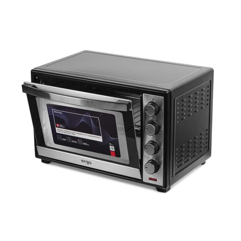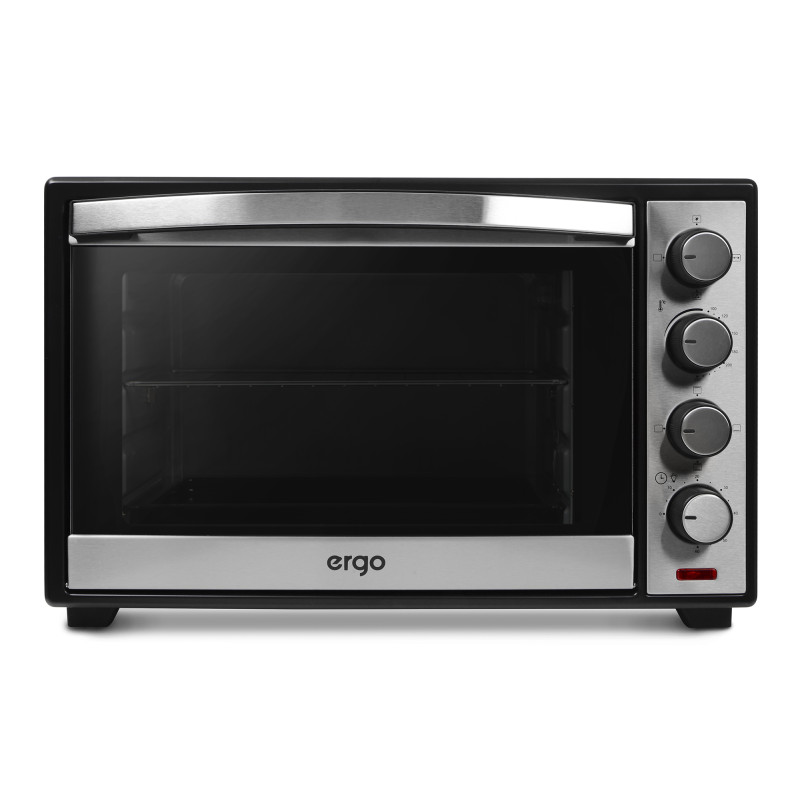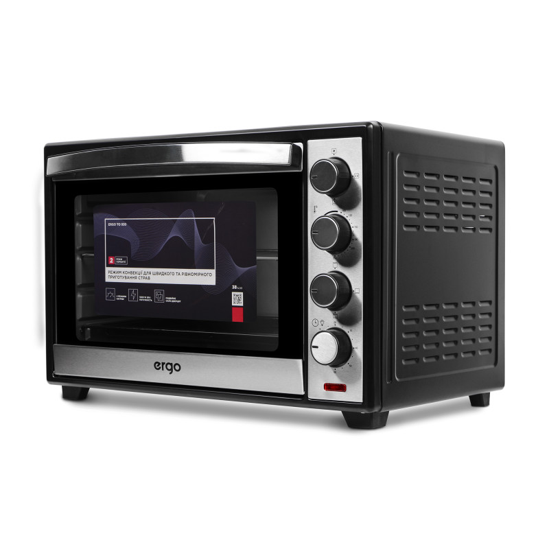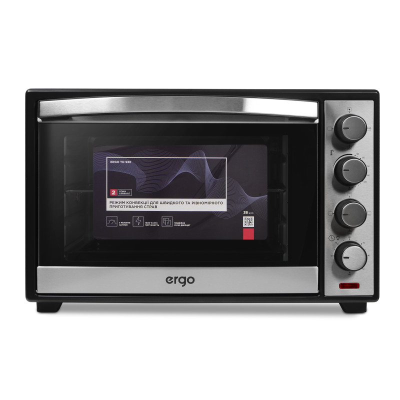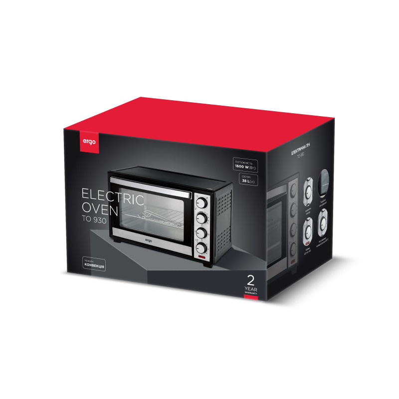 ERGO TO 930 – компактна, функціональна та стильна модель, яка завдяки вдалому поєднанню чорного кольору й матової сталі прикрасить будь-який кухонний інтер’єр. Внутрішній простір, що має об’єм 38 літрів, поділено на декілька рівнів для зручності в користуванні й можливості готувати більшу кількість продуктів одночасно. Чотири ТЕНи дають максимальну потужність 1600 Вт, нагріваючи піч до 250°С.