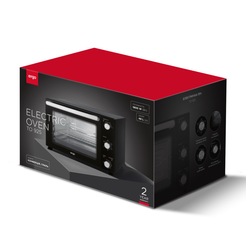 Модель ERGO ТО 925 оснащується одразу чотирма нагрівальними елементами з нержавіючої сталі, які мають сумарну потужність 1800 Вт. Завдяки цьому внутрішній простір об’ємом 48 літрів максимально швидко прогрівається до температури 250 °С, чого достатньо для випікання будь-яких страв. Ступінь нагріву регулюється в 5 положеннях, що дозволяє точно налаштувати режим для приготування навіть найбільш вишуканих рецептів.