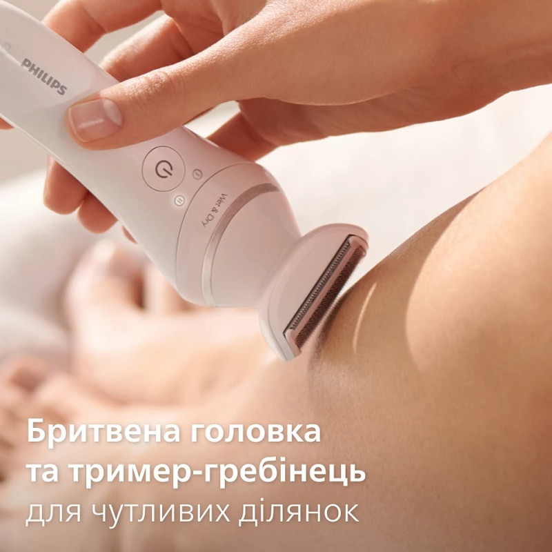 Бритвена головка забезпечує ретельне гоління та лагідніше застосування на чутливих ділянках тіла. Вона йде в комплекті з тримером-гребінцем для створення стилю в зоні бікіні.