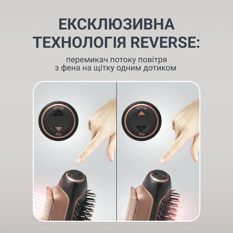 | Особливості | Ексклюзивна технологія Reverse, що дозволяє перемикати потік повітря з фену на щітку одним дотиком Для гладкої зачіски, для об'єму, для ефекту «природної хвилі» |