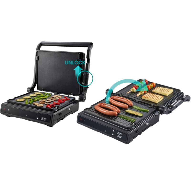Пластини гриля не лише знімні та реверсивні, але й на кожній з них можна встановити індивідуальну температуру, що дає змогу готувати різні види їжі одночасно. Наприклад, ви можете легко приготувати основну страву й гарнір одночасно. Температуру можна встановити в діапазоні від 80 °C до 230 °C, а правильну температуру для кожного типу продуктів ви знайдете в посібнику користувача, що додається.