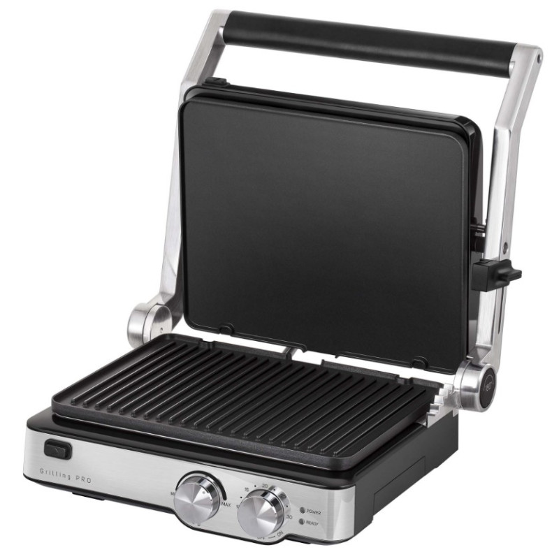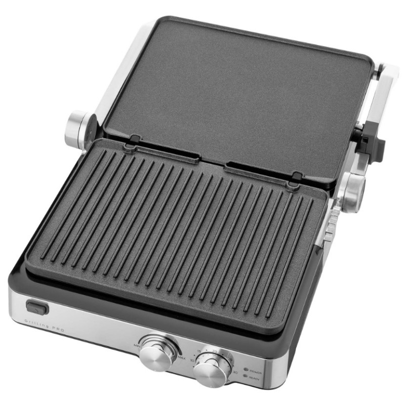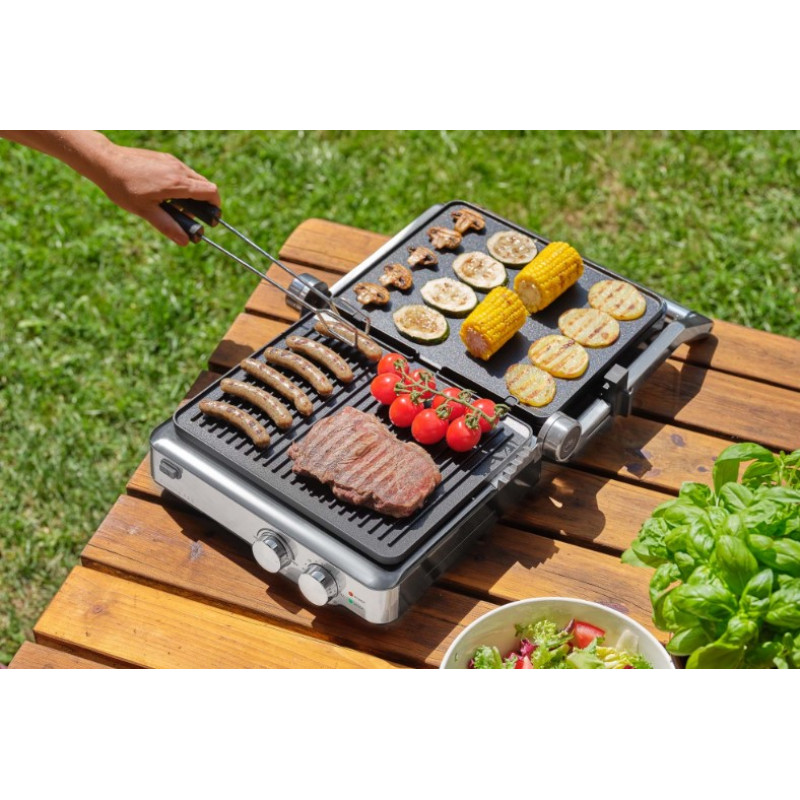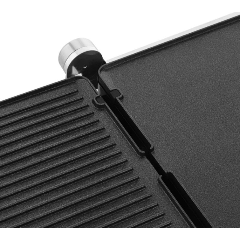 | Особливості | Знімна верхня та нижня решітка з антипригарним покриттям Гладка варильна поверхня Плита з ребристою поверхнею для смаження Гриль можна відкрити повністю, щоб отримати вдвічі більшу площу для смаження |