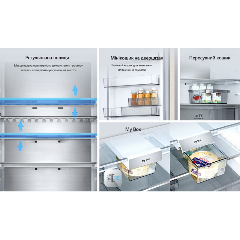 | Функції / можливості | кришка Moist Balance Crisper, Експрес заморозка, Зона свіжості FRESH Balancer, Зона свіжості FRESH Converter, Експрес охолодження, Metal Fresh, Багатопотокова система охолодження Multi Air Flow, Антибактеріальний ущільнювач Bio Shield, Eco Friendly, DoorC |