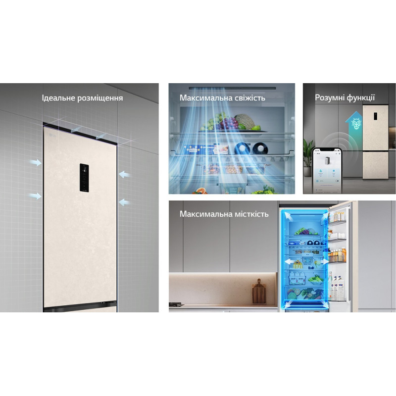 Холодильник LG GC-B509EEKM з нижньою морозильною камерою має загальний корисний об'єм 375 л (262 л холодильне відділення + 113 л морозильне). Пристрій оснащений інверторним компресором, системою Total No Frost, технологією DoorCooling+ та зовнішнім LED-дисплеєм. Зони Fresh Balancer і Fresh Converter дозволяють точно регулювати вологість і температуру для різних продуктів. Річне споживання енергії становить 263 кВт·год (клас E), рівень шуму - 35 дБ. Гарантія - 1 рік повна + 10 років на компресор.