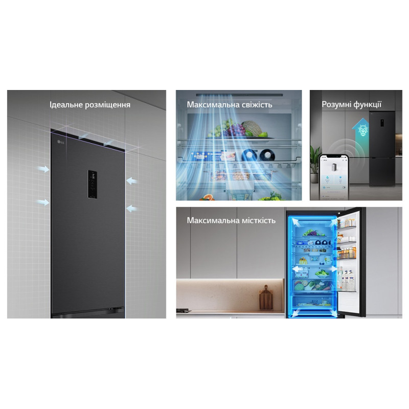 Холодильник LG GC-B509ETKM з нижньою морозильною камерою має загальний корисний об'єм 375 л (262 л холодильне відділення + 113 л морозильне). Пристрій оснащений інверторним компресором, системою Total No Frost, технологією DoorCooling+ та зовнішнім LED-дисплеєм. Зони Fresh Balancer і Fresh Converter дозволяють точно регулювати вологість і температуру для різних продуктів. Річне споживання енергії становить 263 кВт·год (клас E), рівень шуму - 35 дБ. Гарантія - 1 рік повна + 10 років на компресор.