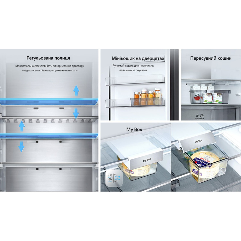 | Функції / можливості | кришка Moist Balance Crisper, Експрес заморозка, Зона свіжості FRESH Balancer, Зона свіжості FRESH Converter, Експрес охолодження, Metal Fresh, Багатопотокова система охолодження Multi Air Flow, Антибактеріальний ущільнювач Bio Shield, Eco Friendly, DoorC |