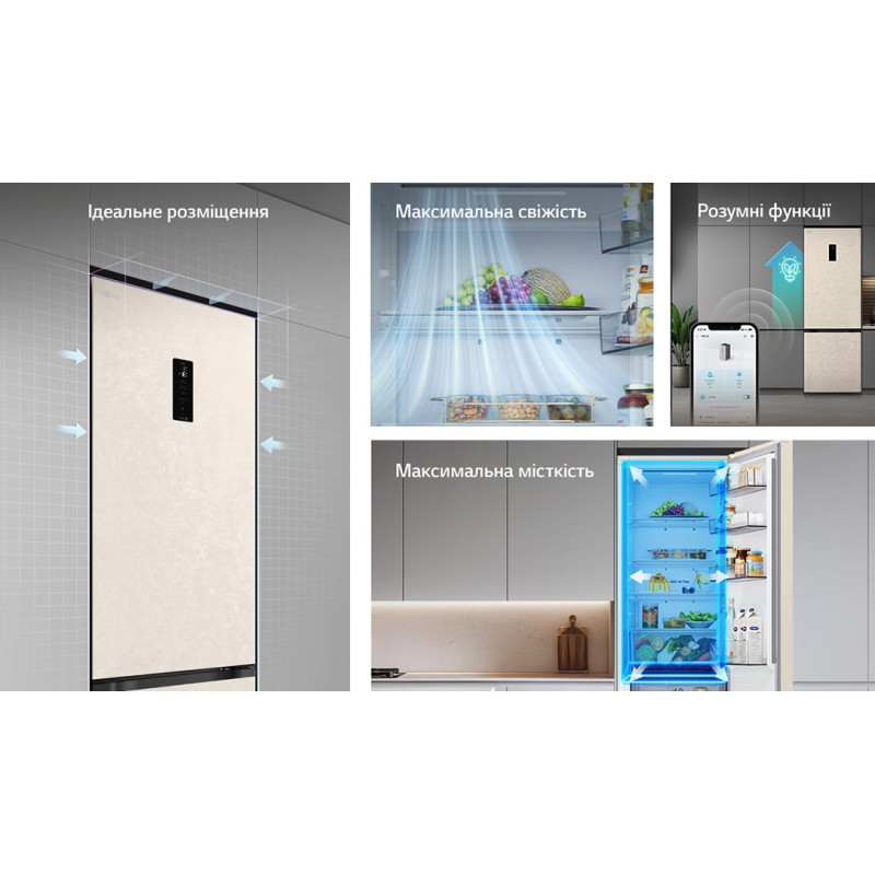 | Функції / можливості | Експрес заморозка, Експрес охолодження, Багатопотокова система охолодження Multi Air Flow, DoorCooling+, Технологія контролю напруги/(196-285 В), Fresh Zone, Сигнал відкритих дверцят, LG ThinQ з керуванням через Wi-Fi, Інтелектуальна система діагностики S |