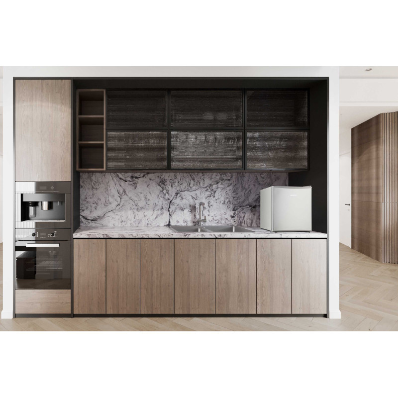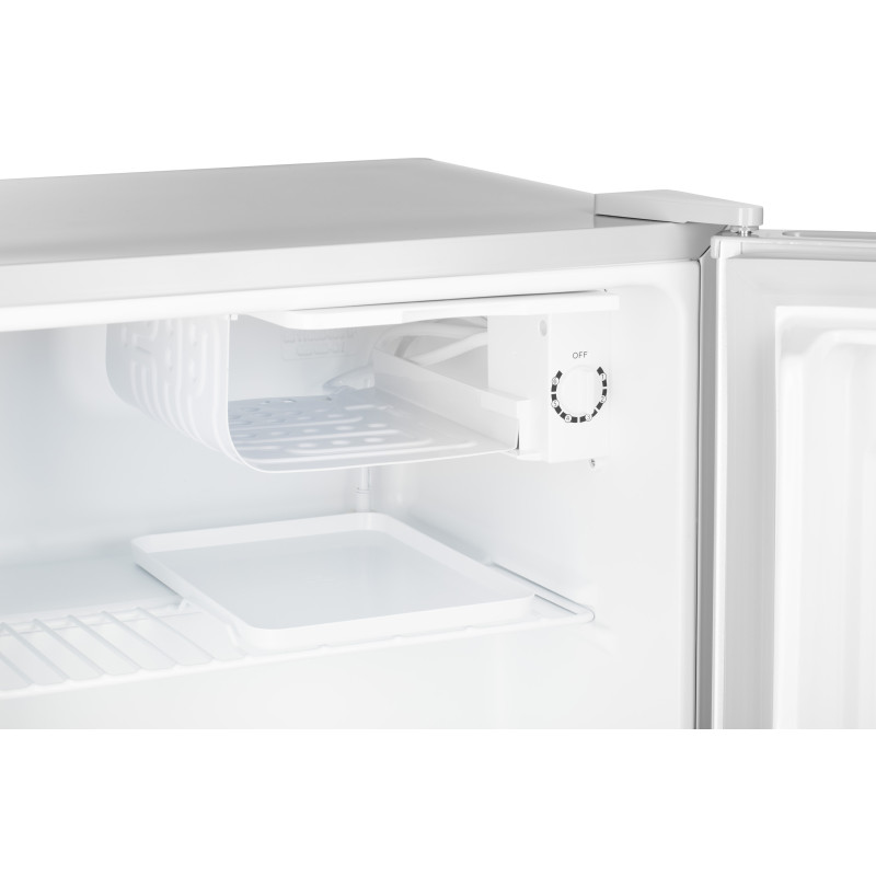 Компактний однокамерний холодильник кольору нержавіючої сталі готельного формату для невеликих приміщень. Клас енергозбереження – А+. Управління холодильником – механічне. Також передбачена можливість перенавішування дверей.