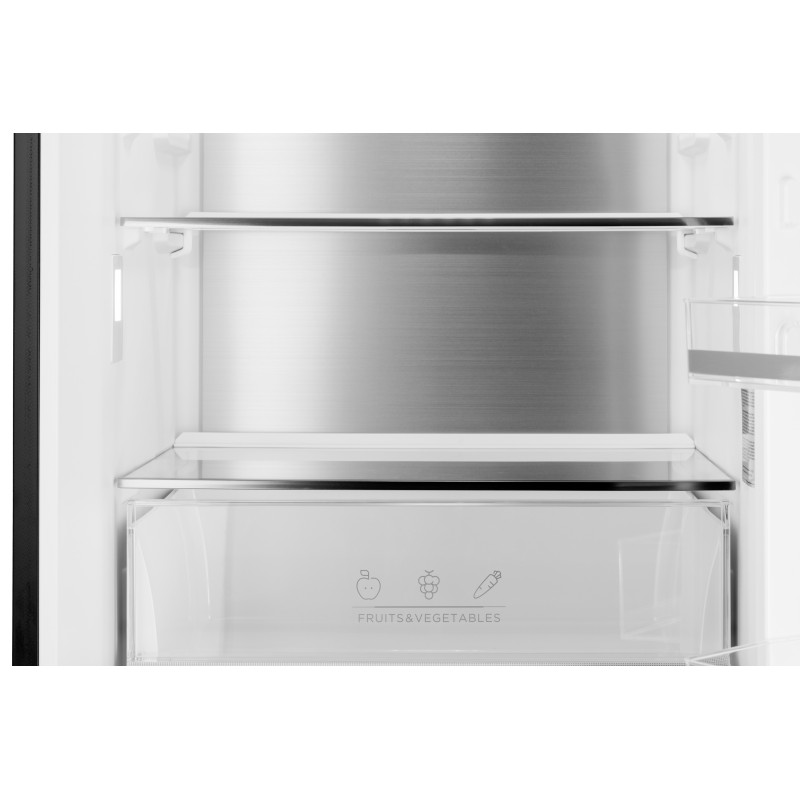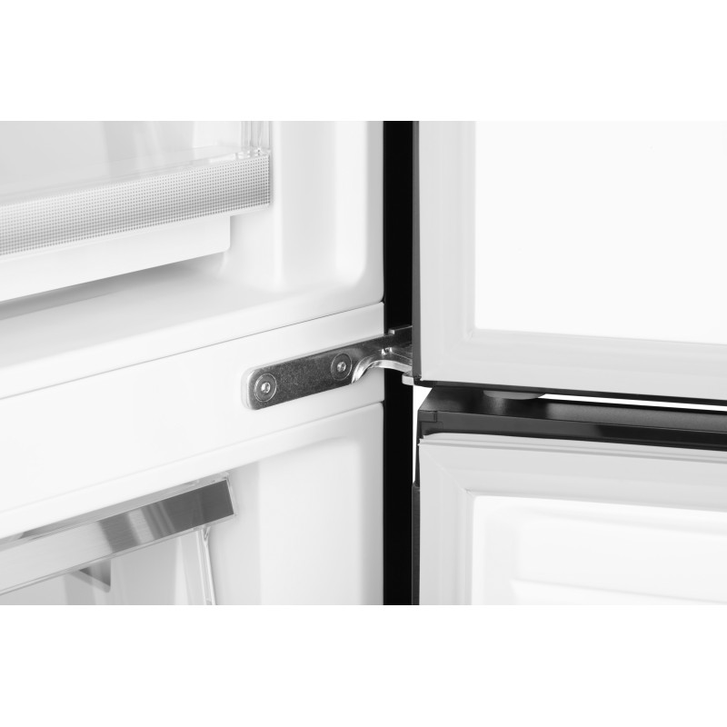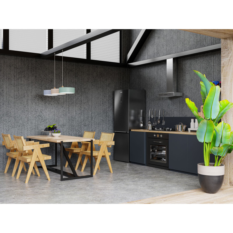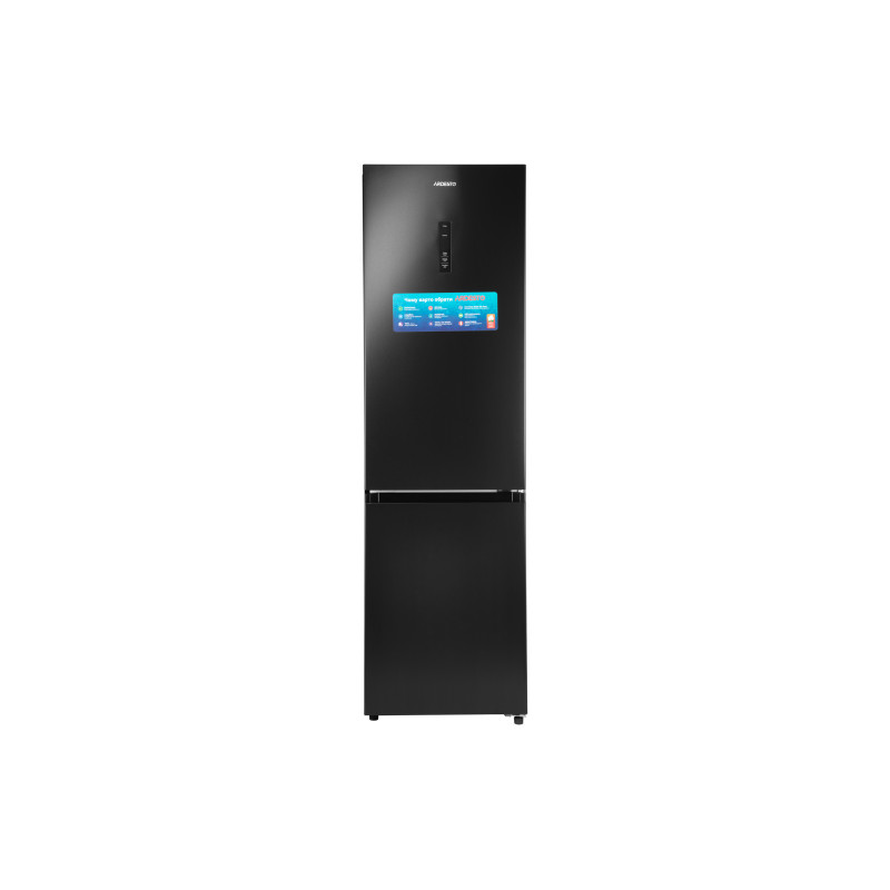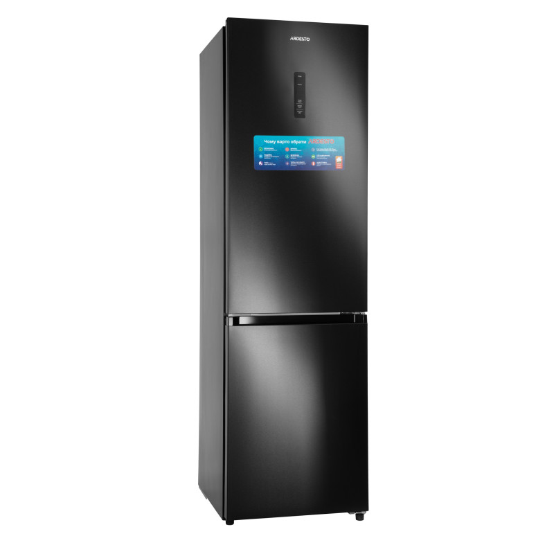 Стильний двокамерний холодильник із фасадом з чорної нерж. сталі з нижньою морозильною камерою. Оснащений зовнішнім цифровим дисплеєм і LED-підсвічуванням. Можливість відчиняти двері під кутом 90° дозволяє розміщувати його впритул до стіни і не мати при цьому проблем з висуванням ящиків. Крім того, двері оснащені системою автоматичного доведення. Великий корисний об’єм: холодильна камера — 256 л, морозильна — 104 л. Клас енергозбереження — А++.