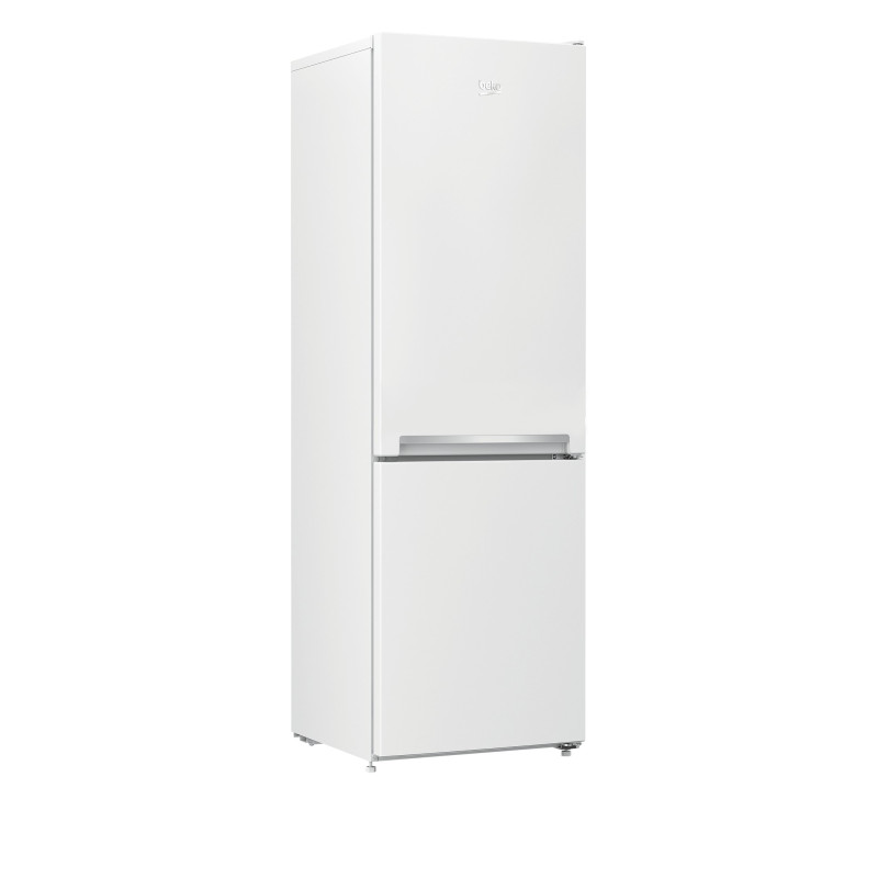 Beko RCSA270K40WN — компактний двокамерний холодильник з нижньою морозильною камерою та загальним об’ємом 262 л. Статична система охолодження та технологія MinFrost зменшують утворення льоду в морозильній камері та скорочують частоту розморожування. Усередині розміщено LED-освітлення та скляні полиці підвищеної міцності. Формат і габарити зручні для розміщення на невеликих кухнях, холодильник працює тихо та має реверсивні дверцята для комфортного встановлення.
