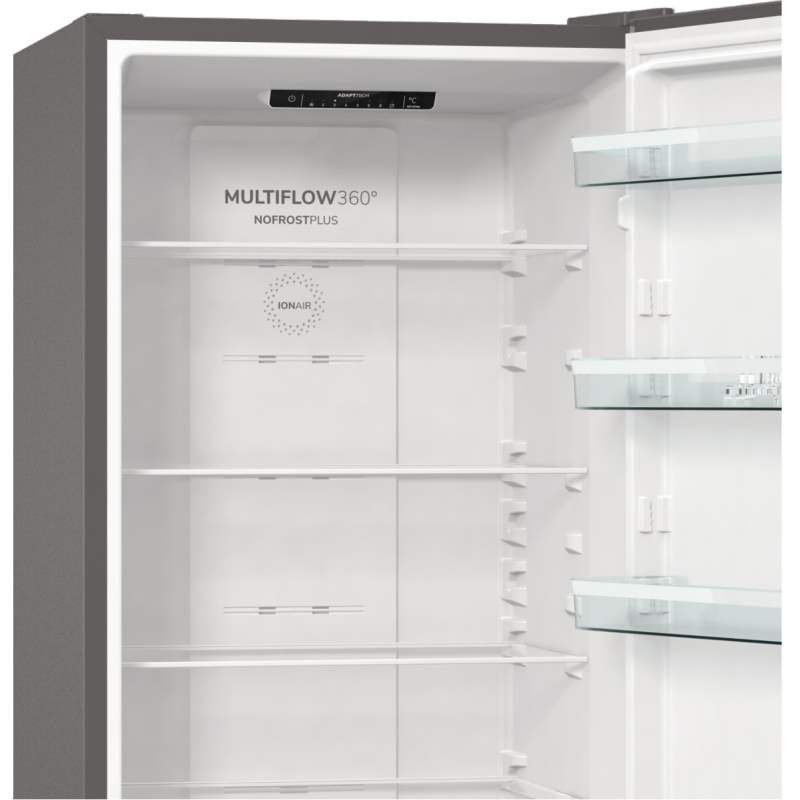 Іонізатор IonAir створює всередині пристрою негативно заряджені іони, які рівномірно розподіляються по всьому холодильному відділенню за допомогою нової системи вентиляції MultiFlow 360°. Повітря, збагачене аніонами, зберігає смак продуктів і видаляє неприємні запахи.