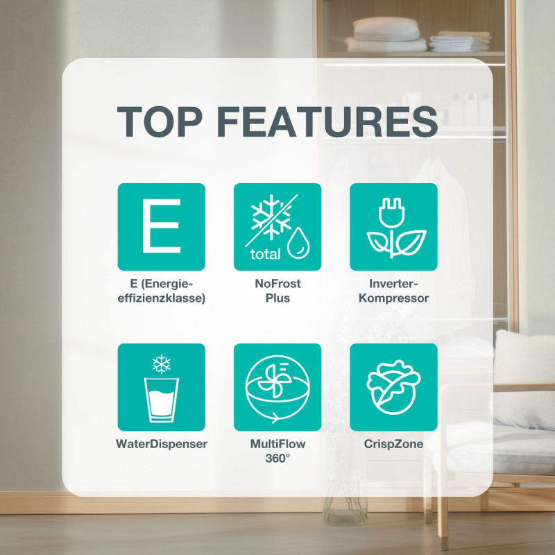 | Інші особливості | Електронне управління SensoTech; Дисплей: LED дисплей; Звуковий сигнал при відчинених дверцятах; Блимаючий індикатор при відчинених дверцятах; Індикатор температури: Цифровий індикатор температури для морозильного та холодильного відділення; Сис |