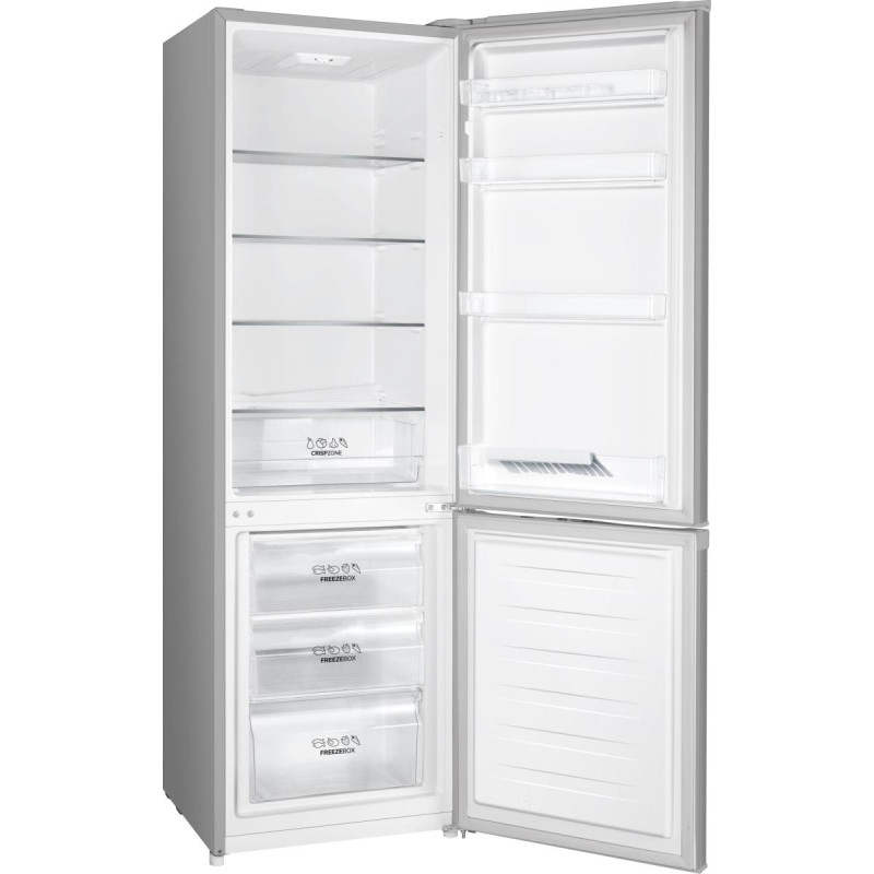 Холодильник Gorenje з нижньою морозильною камерою забезпечує впорядковане зберігання продуктів у двох окремих зонах. Модель поєднує містке холодильне відділення та морозильну камеру з поділом на шухляди. Інверторний компресор підтримує стабільний температурний режим із помірним рівнем шуму. Світлодіодне освітлення забезпечує рівномірне освітлення внутрішнього простору. Конструкція орієнтована на щоденне використання зі зручним доступом до продуктів різних категорій.